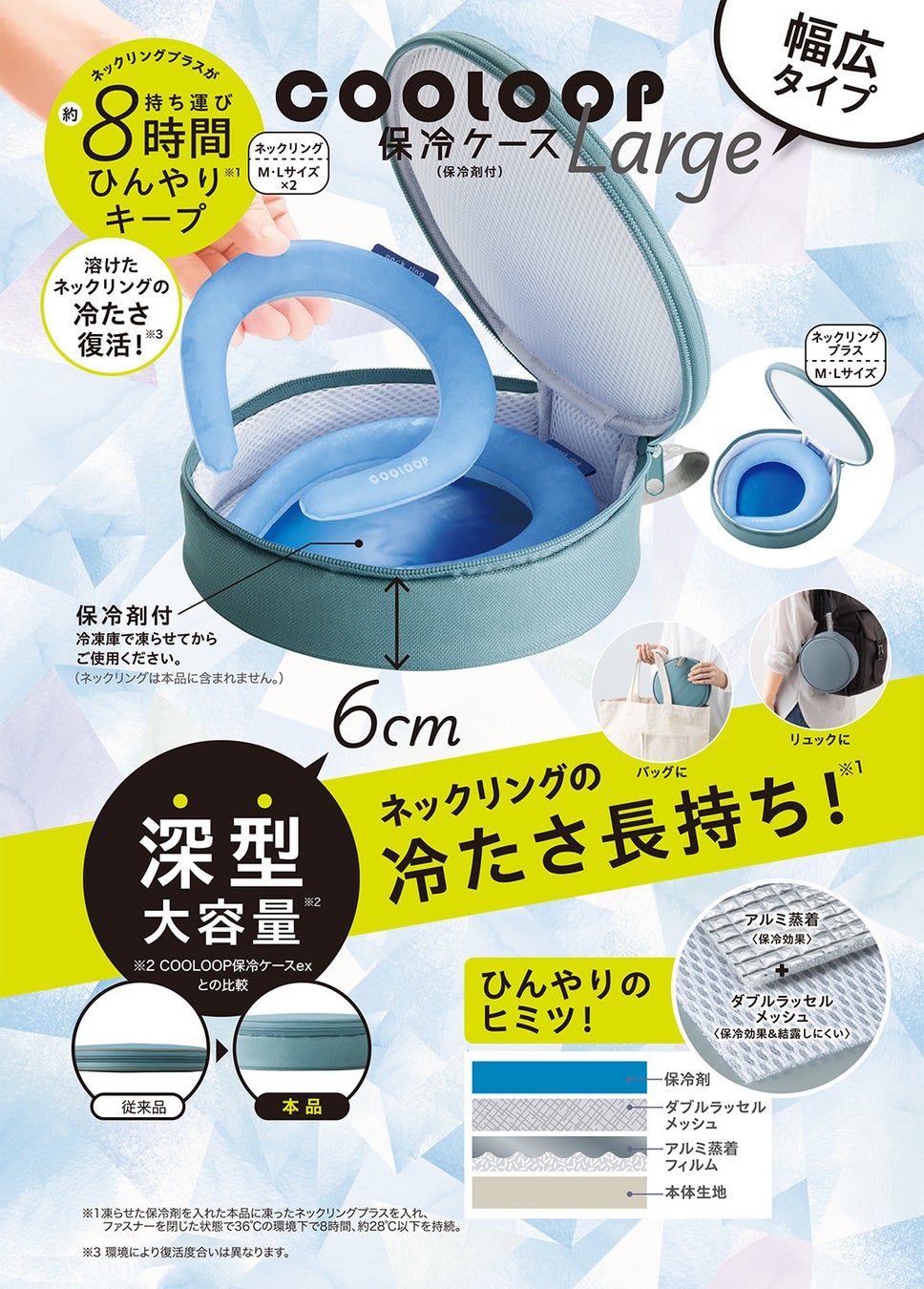 保冷剤などと違い「冷却する必要がなく」「結露がでない」ので、サッと取り出せてパッと使えるので、アウトドアや暑~い夏の外出時はもちろんのこと、室内や電車内、冬にも便利な日常のあらゆるシーンに「クーリングタイム」を提供してくれます。