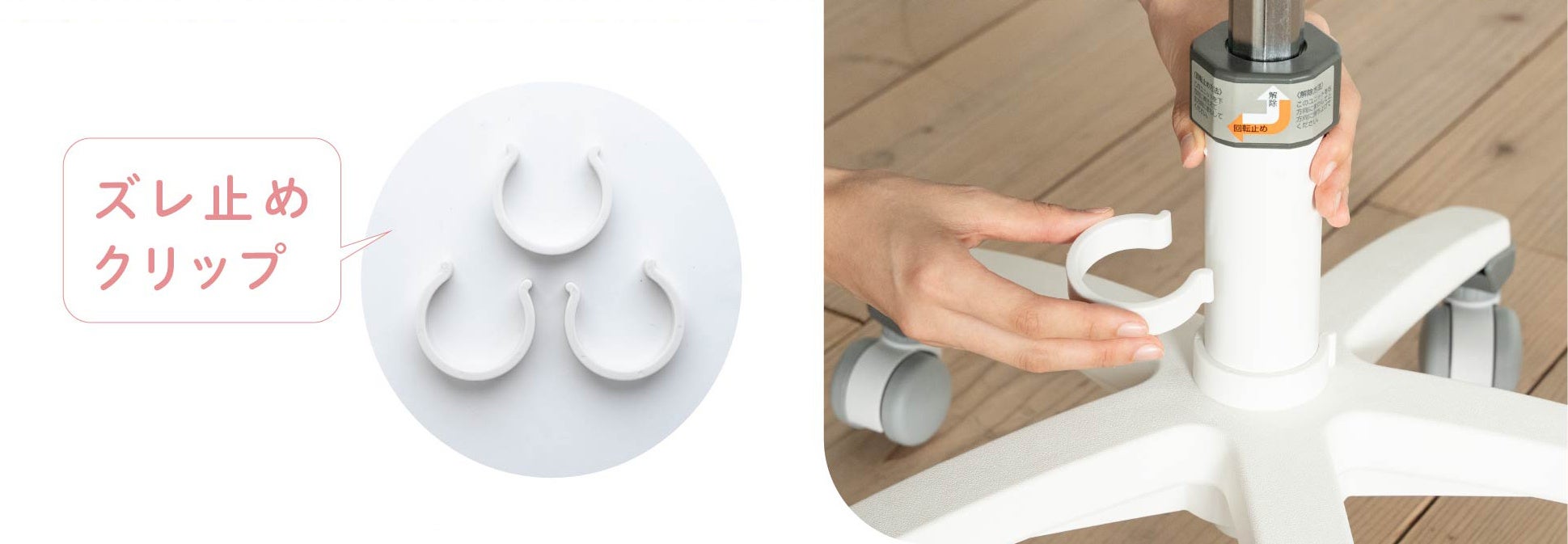 「使っているうちに足置きが下がってしまう」という、お客様の声から生まれたイトーキ独自設計のズレ止めクリップ。フットステップをより安全にお使いいただくために必要な機能です。1脚に3個付属しており、4段階の調節が可能です。足置きがズレることなく、しっかりと保持できるので、より安全にお使いいただけます。