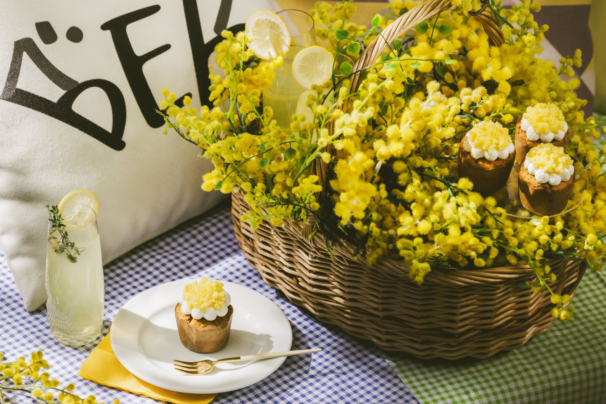 鮮やかな黄色のミモザをモチーフとしたカップケーキは、食感もしっとり柔らかで、ミモザの小さくて可愛いふわふわなお花を連想させるような仕上がりです。ミモザに包まれたバスケットで提供するので、ちょっとしたピクニック気分も味わえます。パブリックスペース「TAMARIBA(タマリバ)」やミモザルームなど好きな場所で楽しめます。