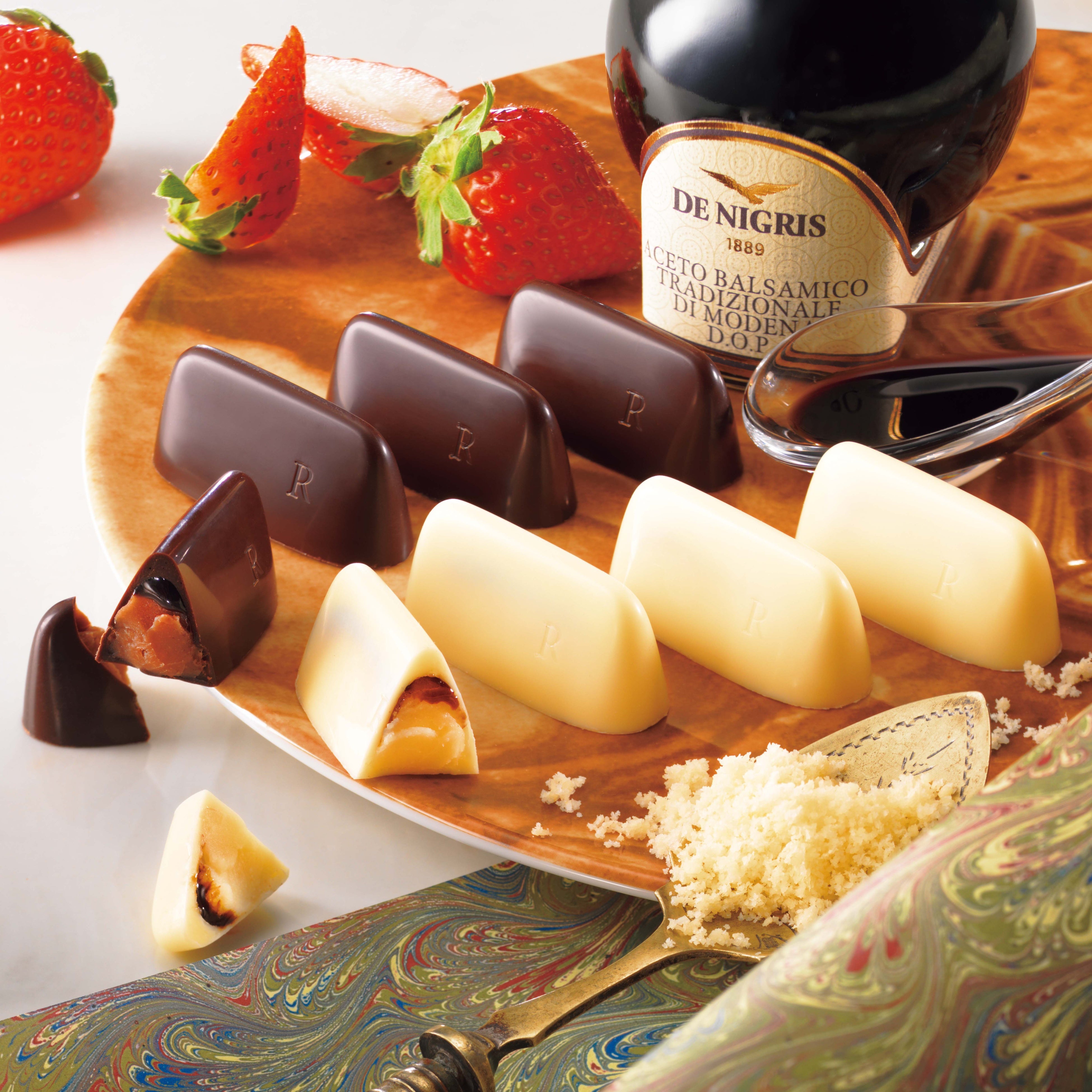 イタリアの伝統的なバルサミコ酢「トラディツィオナーレ」(12年以上熟成)を、チーズ・ストロベリーと合わせて2種類のプラリネショコラに仕上げました。