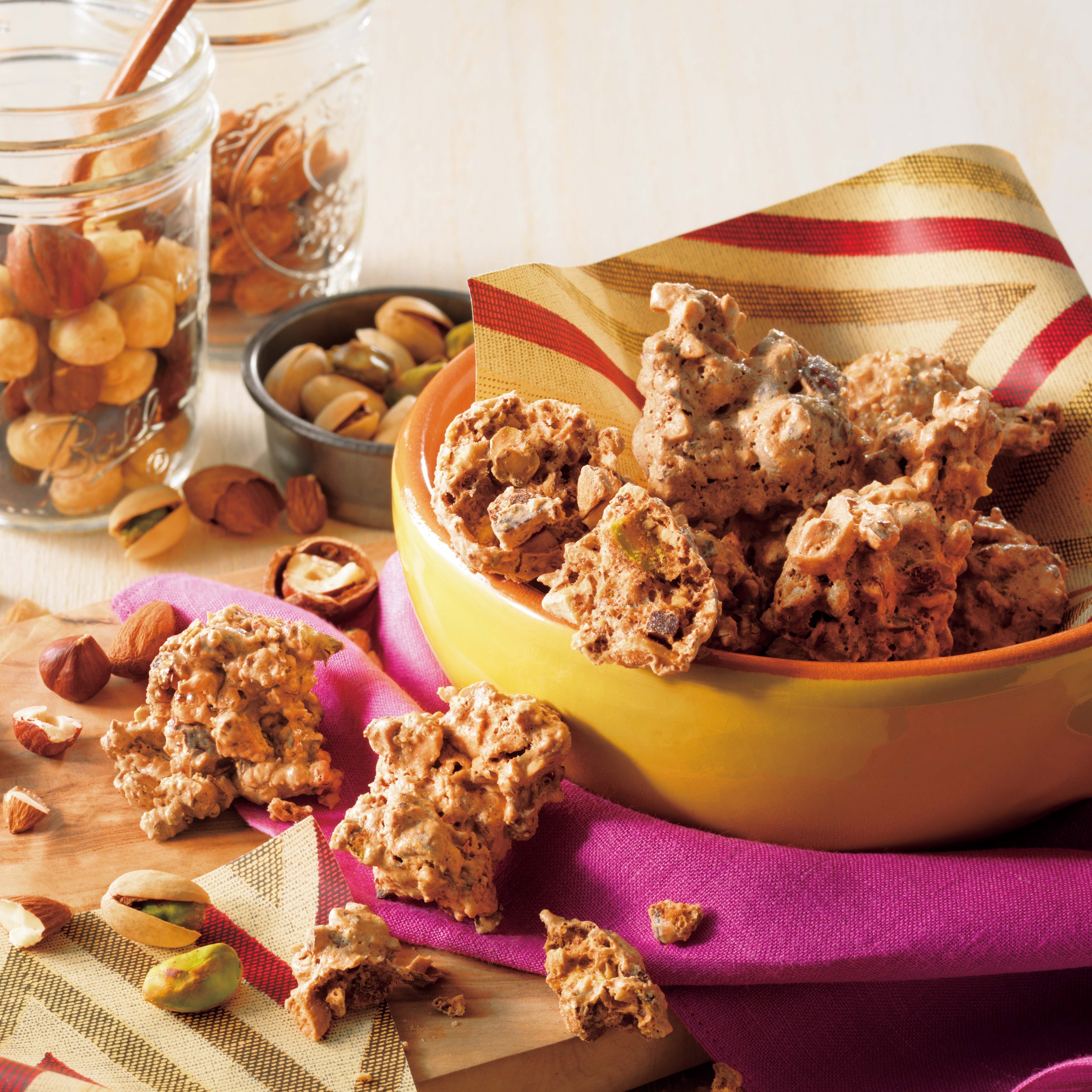 風味豊かなピスタチオ、アーモンド、ヘーゼルナッツをざっくりと砕き、メレンゲと合わせてひと口サイズに焼き上げました。ひと口食べるとザクザクとした食感とともにナッツの風味が口いっぱいに広がるナッツづくしのお菓子です。