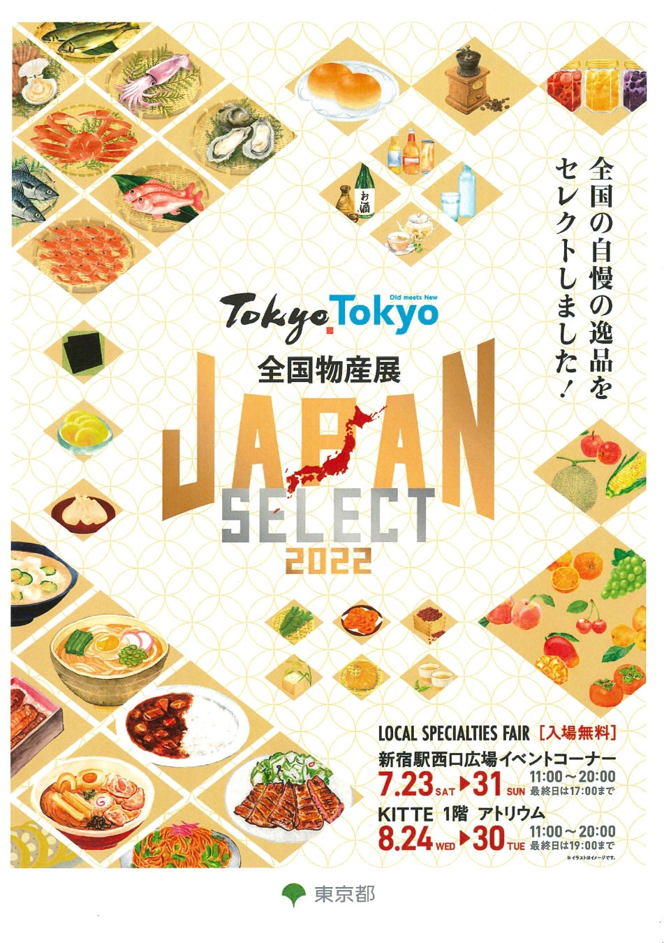 Tokyo 全国物産展JAPAN SELECT 2022(8/24~8/30)がKITTEにて開催されます。都内にあるアンテナショップなどと連携し、特産品の展示や各地の観光PRを通じて日本各地の魅力を紹介する東京都主催のイベントです。