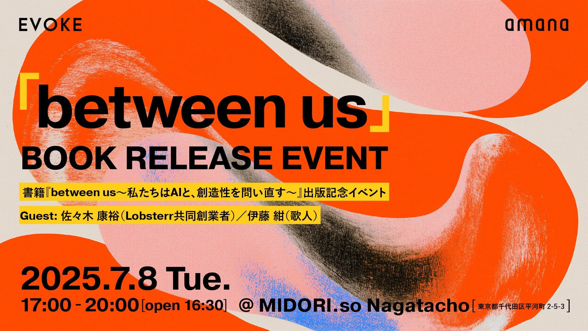 書籍『between us〜私たちはAIと、創造性を問い直す〜』の刊行を記念し、2025年7月8日(火)にEVOKEによるトーク&展示イベントをMIDORI.so NAGATACHOにて開催いたします。生成AIと人間の感性が交差する現場のリアルな試行錯誤を共有し、これからの創造性について考える場です。