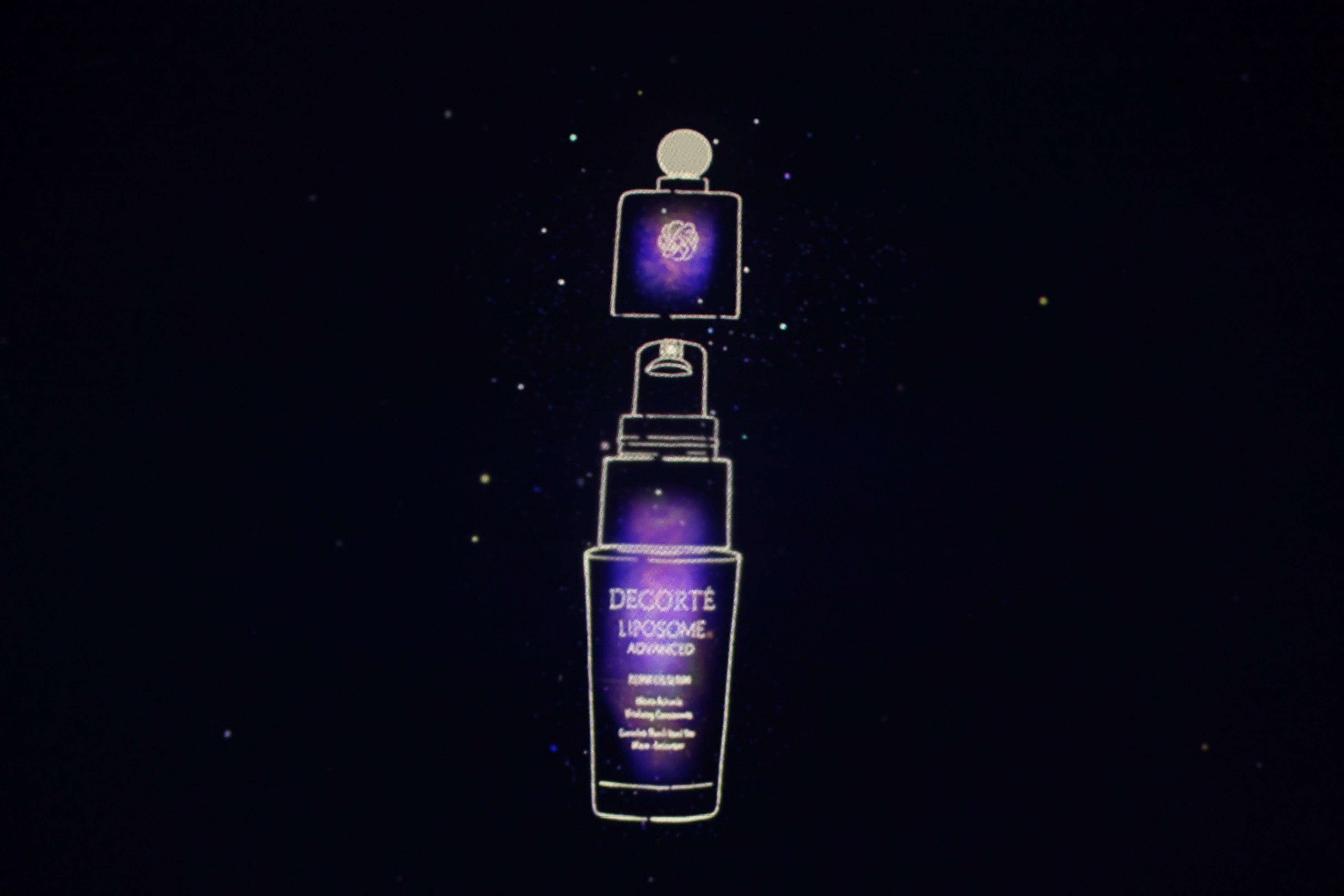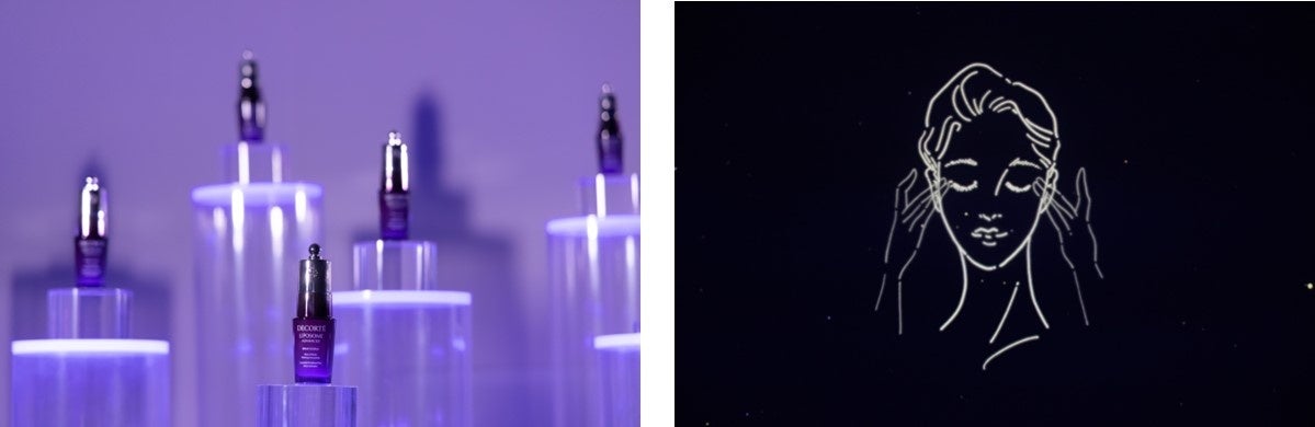 1992年発売の初代リポソーム美容液「モイスチュア リポソーム」から始まった“リポソーム”シリーズの歴史を、商品を模った星座とともに振り返ったのち、今回発売される「リポソーム アドバンスト リペアアイセラム」の独自処方について星空に浮かぶCGやイラストと共に紹介し、「日々のケアで、今と未来の目もとを美しく輝かせてほしい」という思いをお伝えしました。
