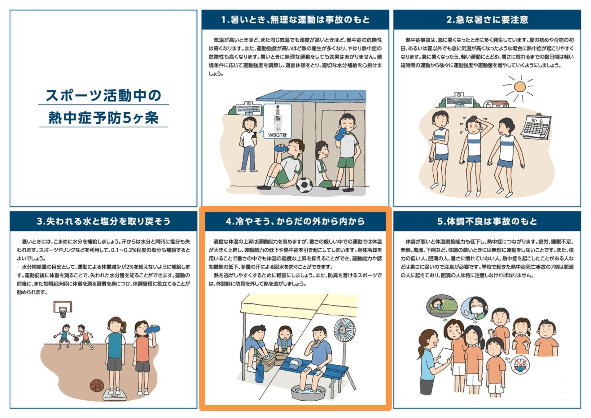 そこで今回の改訂では、身体冷却を大きく取り上げることにし、スポーツ活動中の熱中症予防5ヶ条へ入れることにしました。