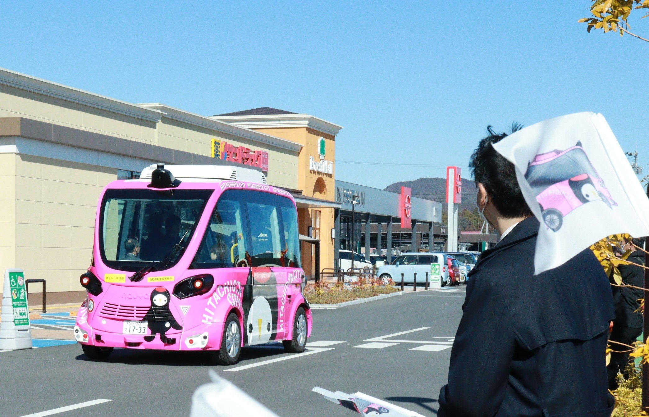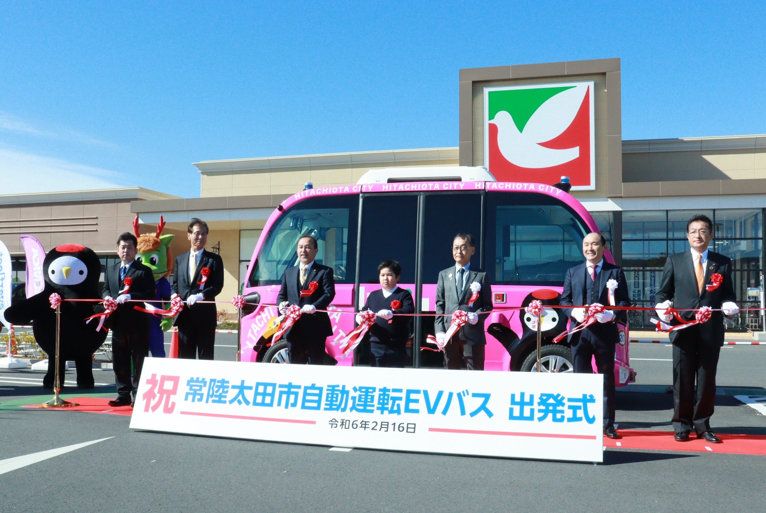 2月16日、常陸太田市の商業施設で出発式が行われました。宮田達夫市長は「国内初の自動運転レベル4対応の新型車両 EVOを常陸太田市で走らせることができて嬉しい。バスによって市の魅力を100%アップさせます」と挨拶され、出席者とともにテープカットを行いました。