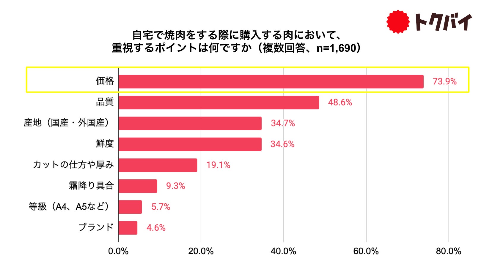 自宅で焼肉をする際に購入する肉の種類について聞いたところ、第1位「牛カルビ」67.0%、第2位「ソーセージ」48.9%、第3位「牛ハラミ」42.0%でした。肉を購入する際には7割以上が「価格」を最も重視しており、続いて「品質」、「産地」や「鮮度」が続きました。