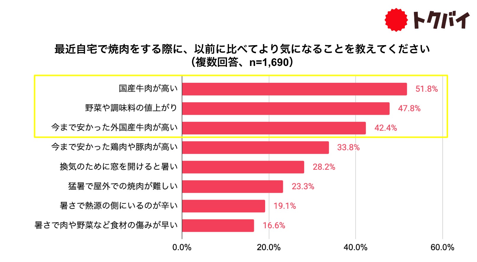 4) 「おうち焼肉派」の最近の悩みは牛肉や野菜・調味料の値上がり。「特売の肉」「値引き品」「盛り合わせ」が肉のコストを抑える強い味方に