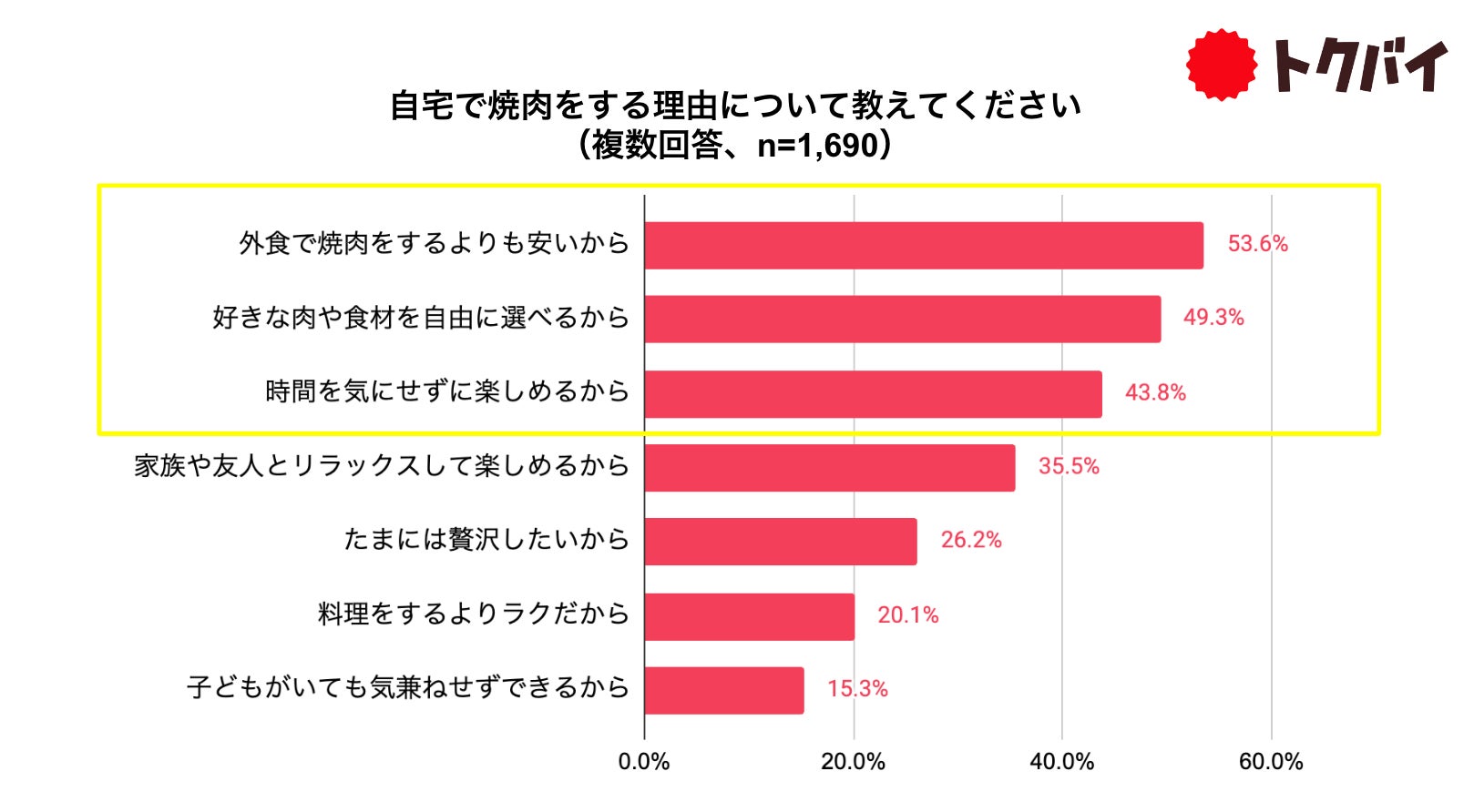 普段の自宅での焼肉の実施状況をたずねたところ、全体の約65%が「自宅で焼肉をする」と回答。そのうち3割以上が月に1回以上の頻度で実施していることがわかりました。自宅で焼肉をする理由として多かったのは、「外食で焼肉をするよりも安いから」53.6%、次いで「好きな肉や食材を自由に選べるから」49.3%、「時間を気にせず楽しめるから」43.8%と、コスパや自由度の高さが上位にあがりました。