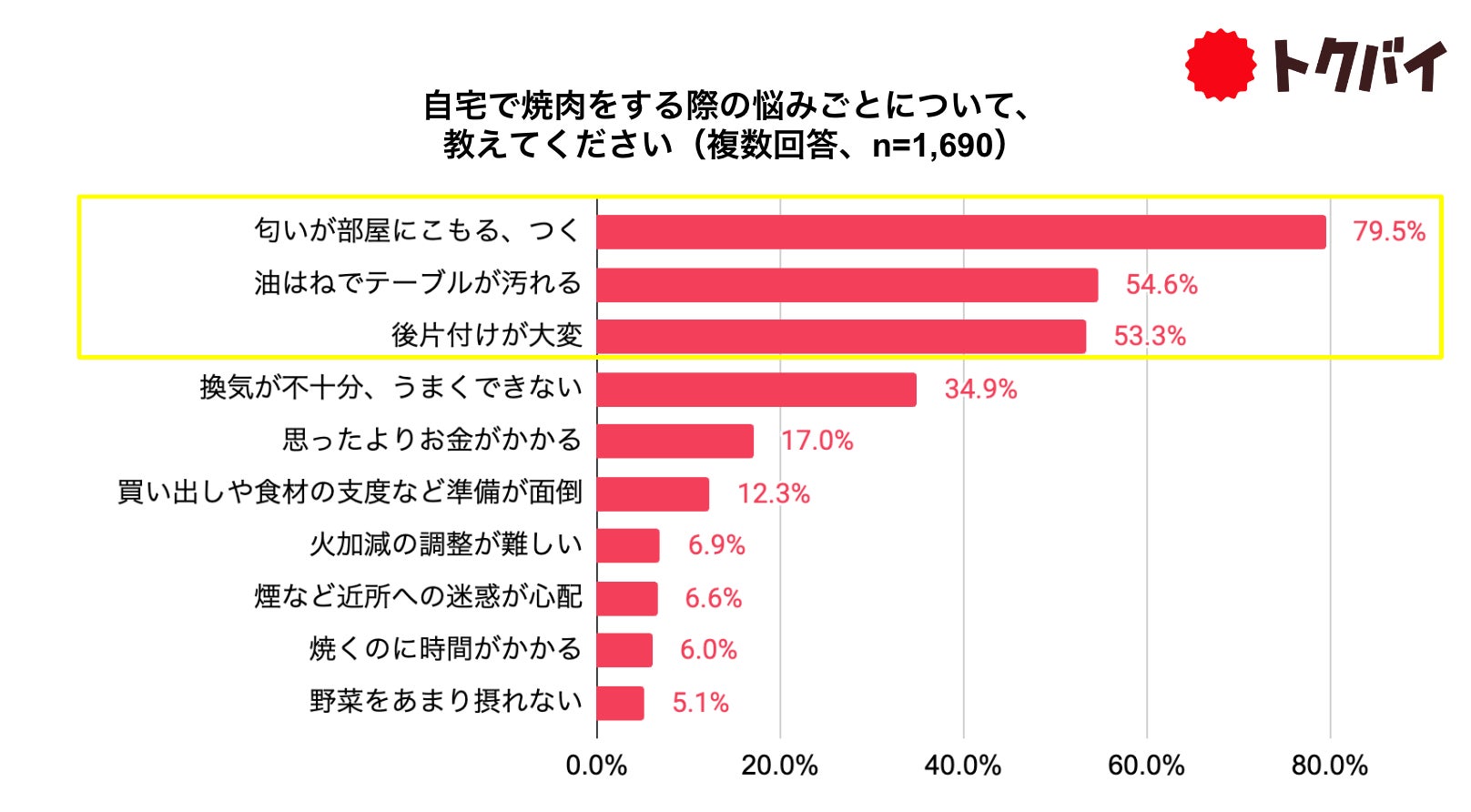 一方で、自宅で焼肉をする際の悩みごとについては、「匂いが部屋にこもる、つく」79.5%、「油はねでテーブルが汚れる」54.6%、「後片付けが大変」53.3%などが上位にあがりました。自由に楽しめて経済的である半面、匂いや後片付けなどの負担を感じていることがわかりました。