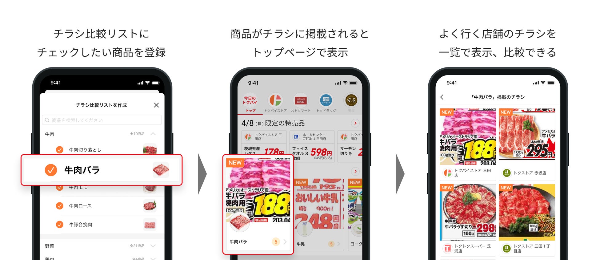 「いつも買う商品のチラシを比較したい」というユーザーの声を元に、AI画像解析技術を活用して開発した「購入頻度の高い商品について、よく行く店舗のチラシを簡単に比較ができる」機能です。AIが分類・分析したデータベースを利用して、よく行く店舗のチラシの中から、ユーザーがあらかじめ登録している商品を一覧で表示します。登録した商品がよく行く店舗のチラシに掲載されるとトップページに表示され、他の店舗のチラシとスムーズに比較ができるため、ユーザーは手間なくお得に買い物をしやすくなります。
