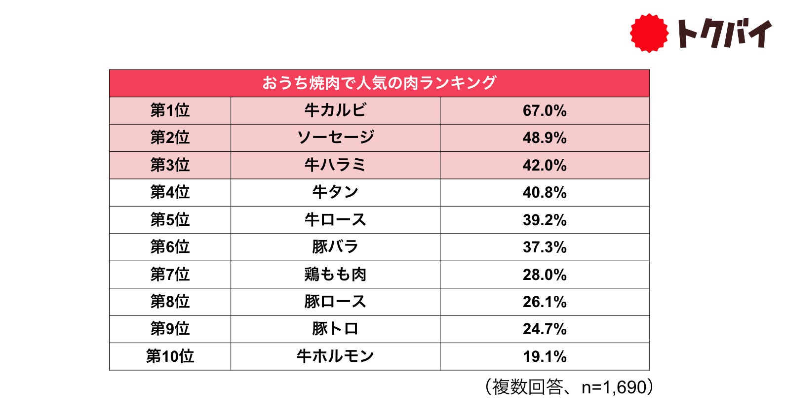 注目は焼肉の定番である牛カルビやハラミに並んで、ソーセージが2位に入っていること。6位以降は豚肉や鶏肉もランクインしています。安価で子どもも食べやすい食材を用意するという「おうち焼肉」ならではの肉選びが反映された結果となりました。