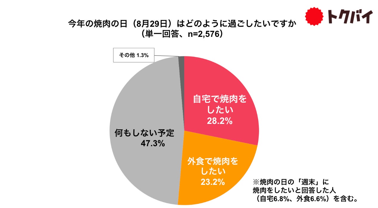 「焼肉の日」の過ごし方をたずねたところ、約半数が焼肉をしたいと回答。焼肉の日もしくはその週末に「自宅で焼肉をしたい」人は28.2%、「外食で焼肉をしたい」人は23.2%で、トクバイユーザーにおいては「おうち焼肉派」が5ポイント上回る結果となりました。今年は8月29日が木曜日で平日のため、「焼肉の日」の週末に食べたいと回答した人(週末に自宅で焼肉をしたい6.8%/週末に外食で焼肉をしたい6.6%)を含んだ割合となっています。