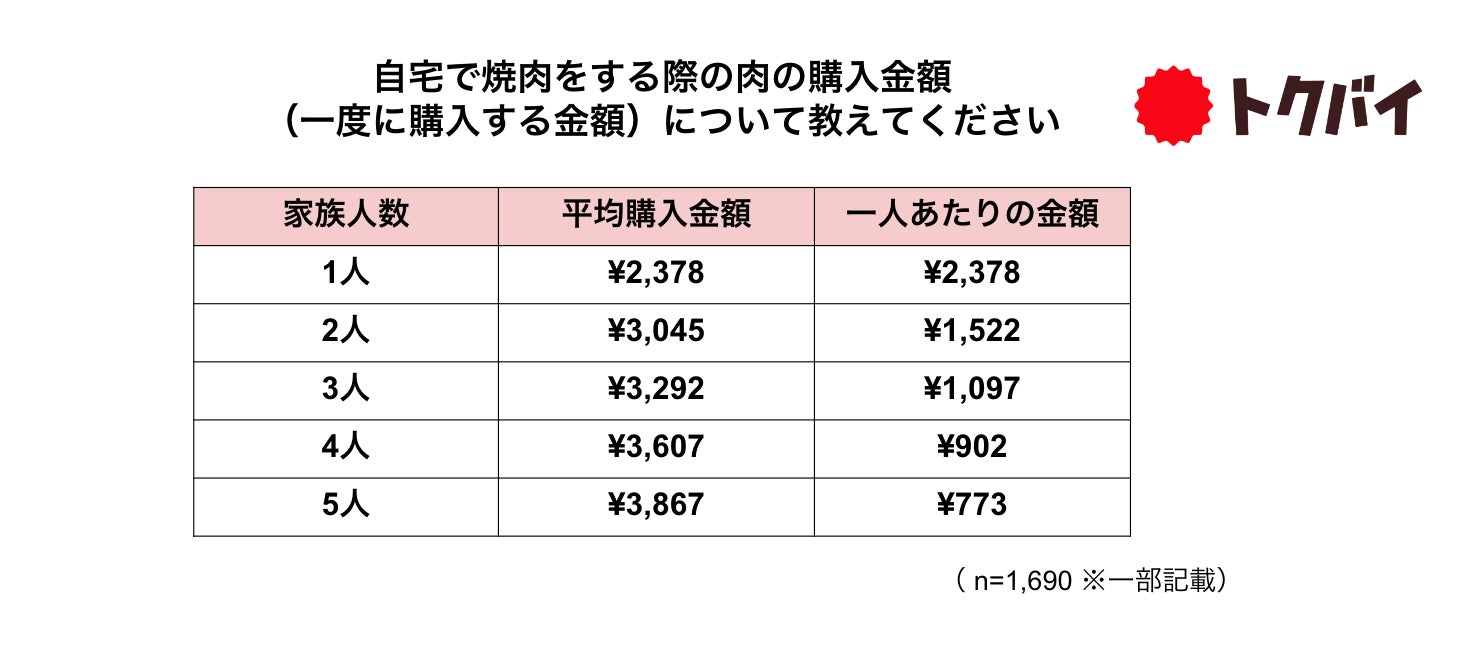 よりコストパフォーマンスを重視する「おうち焼肉」、肉の平均購入金額は家族が増えるほど一人あたりの金額は抑えめになり、4人家族の場合で合計3,607円、一人あたり902円となりました。