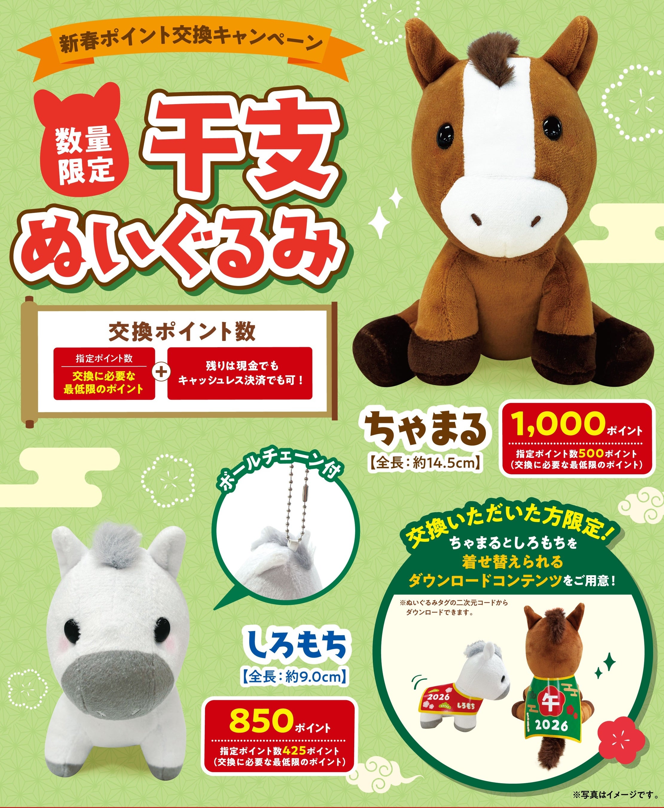 サミットは、年始恒例企画としてオリジナルの干支ぬいぐるみをサミットポイントで交換できるキャンペーンを行います。2026年は午のぬいぐるみ、茶色の「ちゃまる」と白の「しろまる」が登場します。