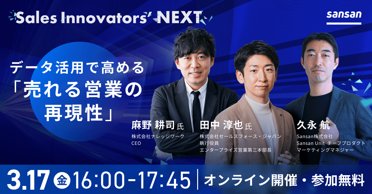 「Sales Innovators’ NEXT」は、各企業の営業をけん引するリーダーの方々をゲストに迎え、営業力強化・営業生産性向上をテーマに、新時代の営業組織のあり方や営業DXの未来について語るオンラインイベントです。初回である今回は、データ活用で高める「売れる営業の再現性」と題して、実体験を交えた営業手法の成功事例や今向き合っている課題など、営業に携わるビジネスパーソンであれば誰もが知りたい情報をお届けします。