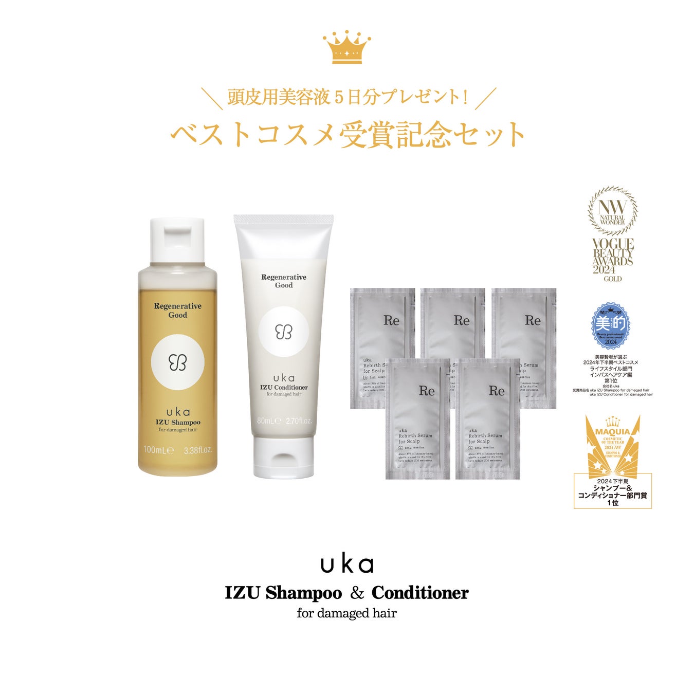 セット内容:uka IZU Shampoo for damaged hair 100mL / uka IZU Condhitioner for damaged hair 80mL / uka Re serum for scalp サンプル(5mL) 5日分