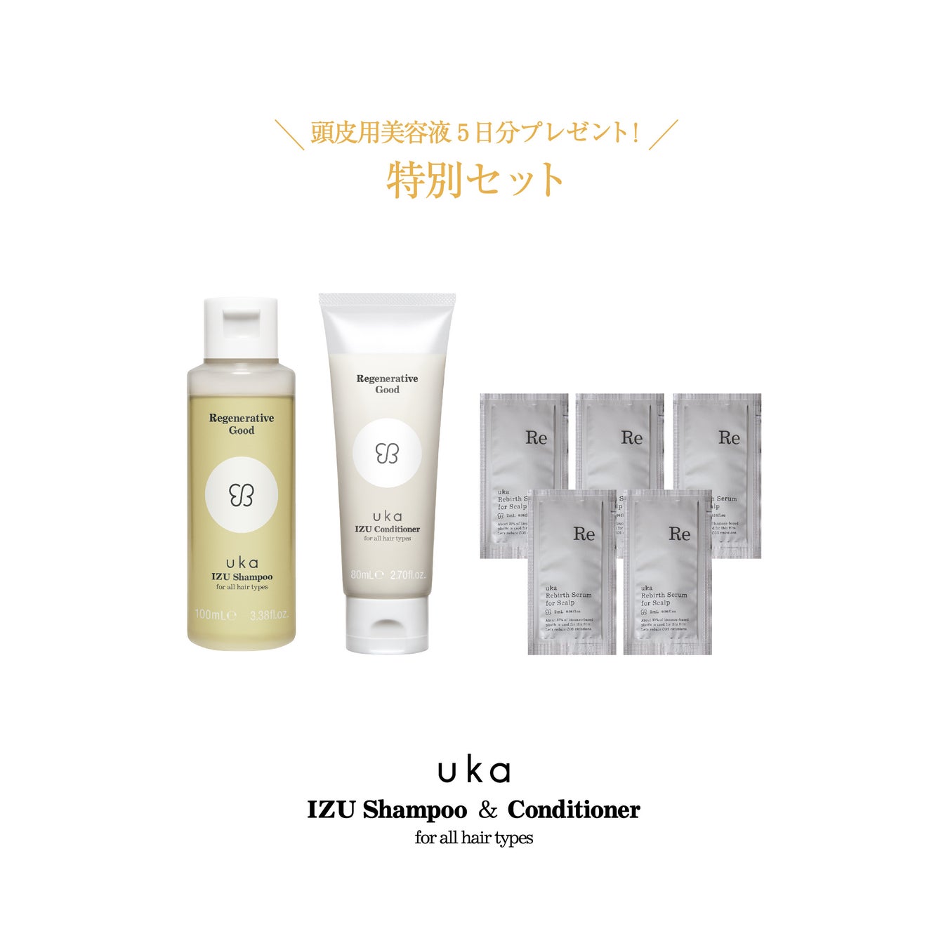 セット内容:uka IZU Shampoo for all hair types 100mL / uka IZU Conditioner for all hair types 80mL / uka Re serum for scalp サンプル 5日分
