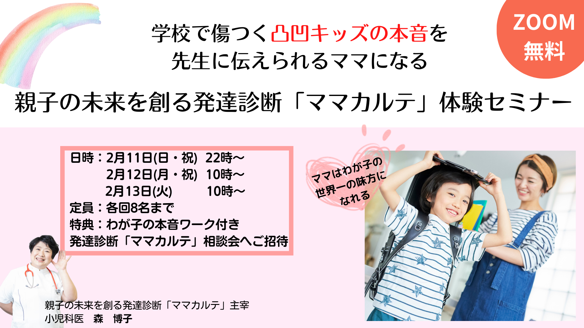 初めまして。発達科学コミュニケーショントレーナーで小児科医の森博子です。この度、『学校で傷つく凸凹キッズの本音を先生に伝えられるママになる 親子の未来を創る発達診断「ママカルテ」体験セミナー』を、2/11、2/12、2/13日にZOOMにて開催いたします。