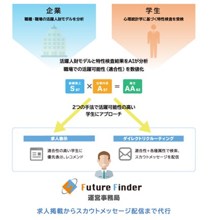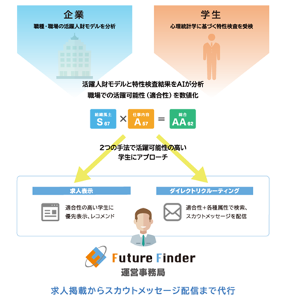 「Future Finder®」は、心理統計学を活用した診断エンジンを用いて、採用企業と学生とのマッチングを生み出す就職支援サイトです。