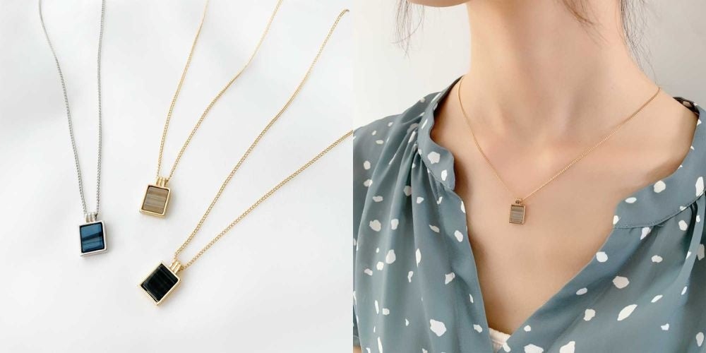 カジュアルファッションにもマッチするようなスクエアモチーフのネックレス。