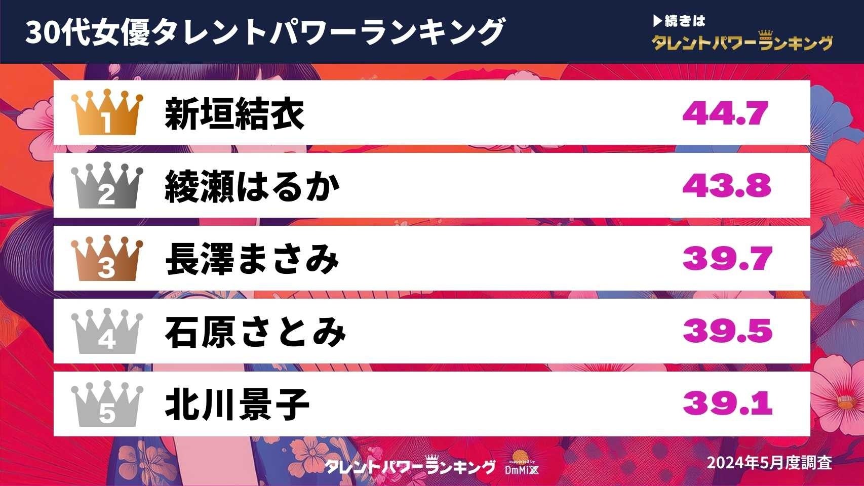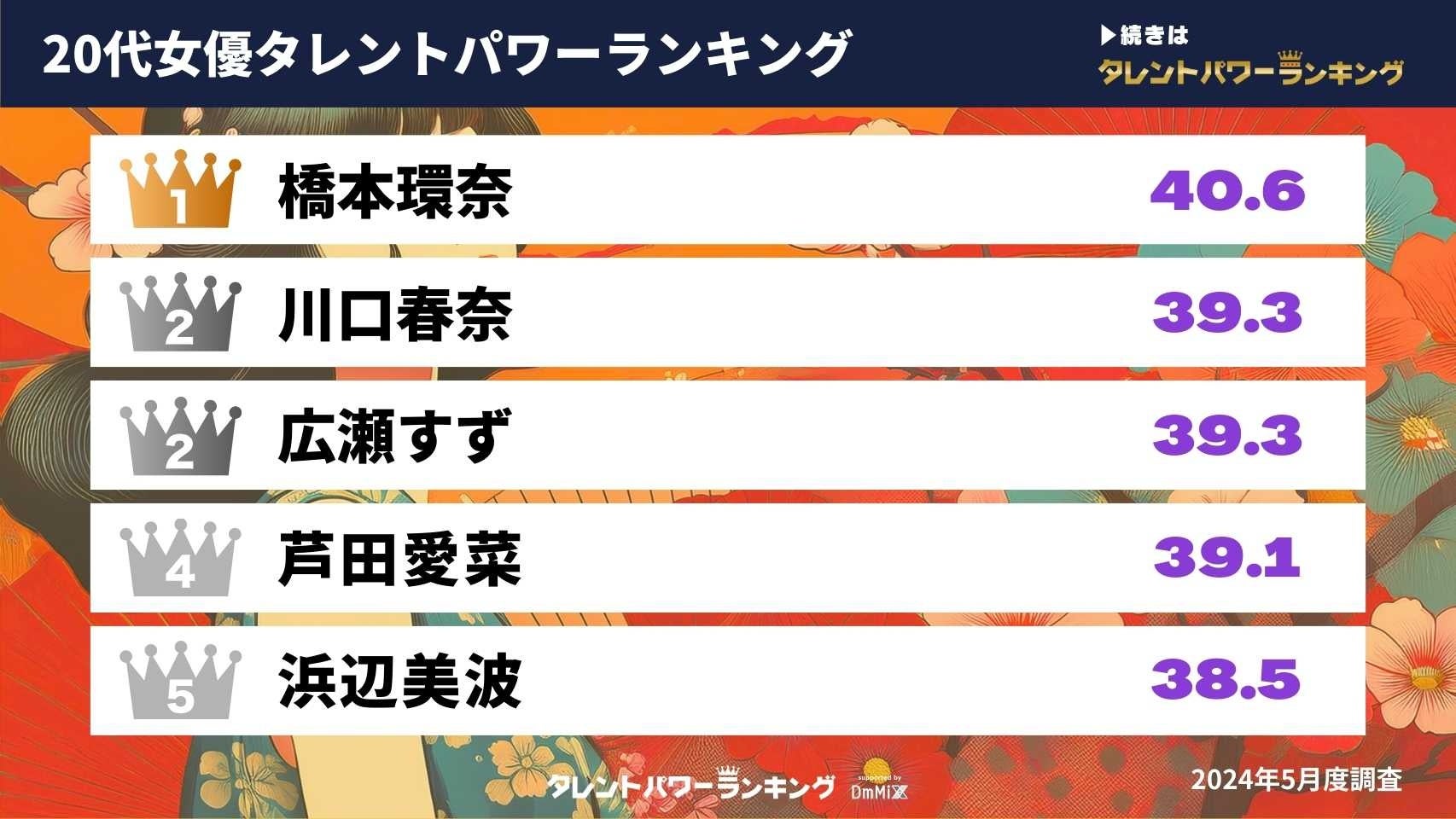 『タレントパワーランキング』では、タレントパワーランキングに登録されている、2024年9月1日時点で年齢が20代・30代の女優のパワースコアを調査。