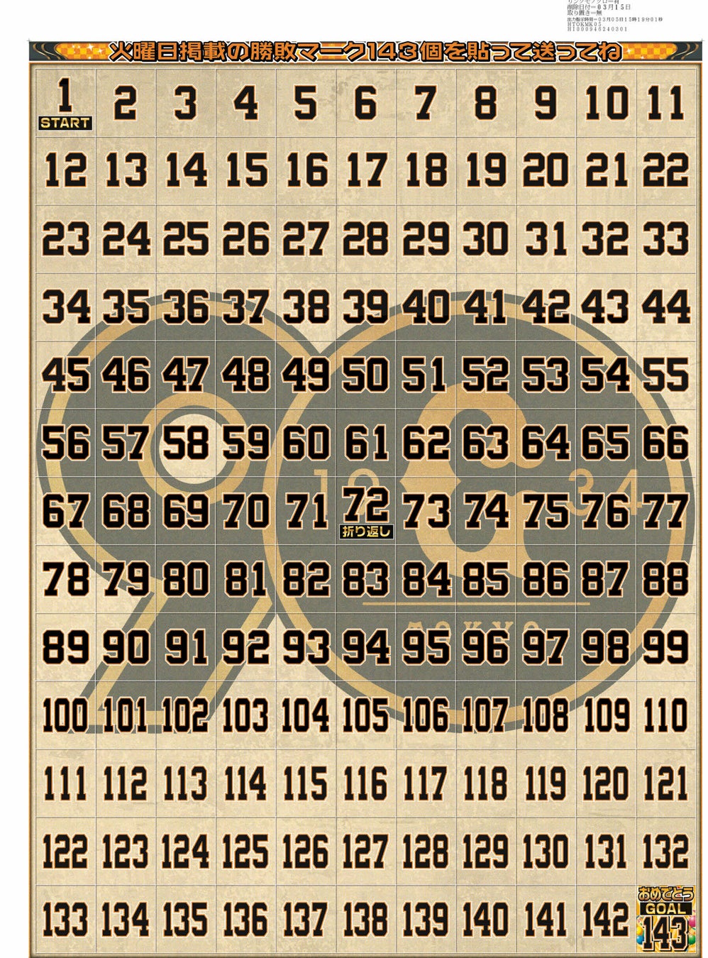 毎年好評をいただいている台紙紙面にマークを貼るプレゼント企画を、今年も行います。3月29日(金)に開幕するセ・リーグ公式戦の最終試合143試合目まで、143枚の勝敗マークを、紙面台紙に貼付してお送りいただいただく企画です。