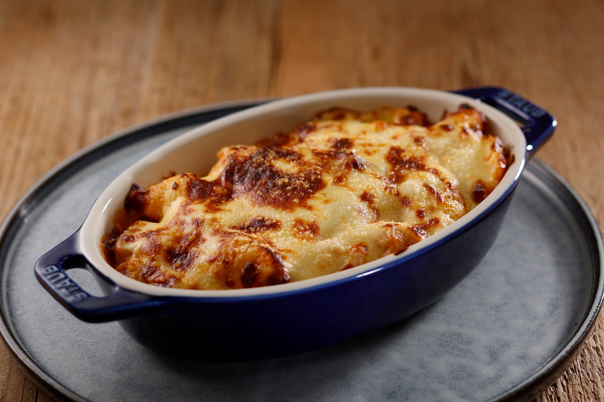 エビとイカ、貝殻の形をしたショートパスタ[コンキリエ]を使用。高温の石窯で焼き上げるグラタンをぜひお楽しみください。