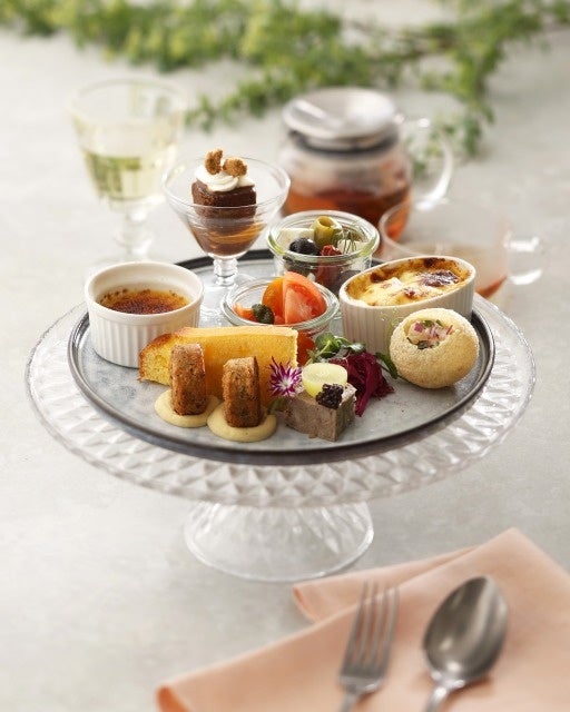 アペタイザー・セイボリーアイテム・スイーツが1プレートになったハイティーです。お好みに合わせて、セットの紅茶やアルコールとともにお楽しみいただけます。