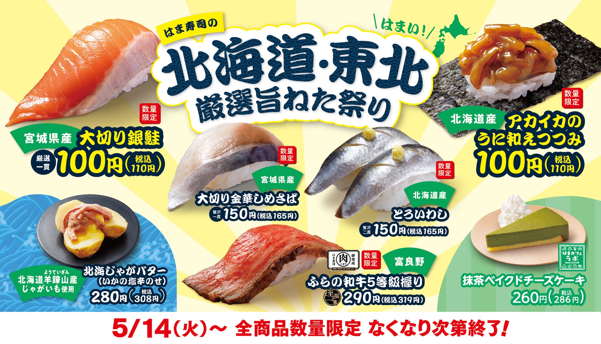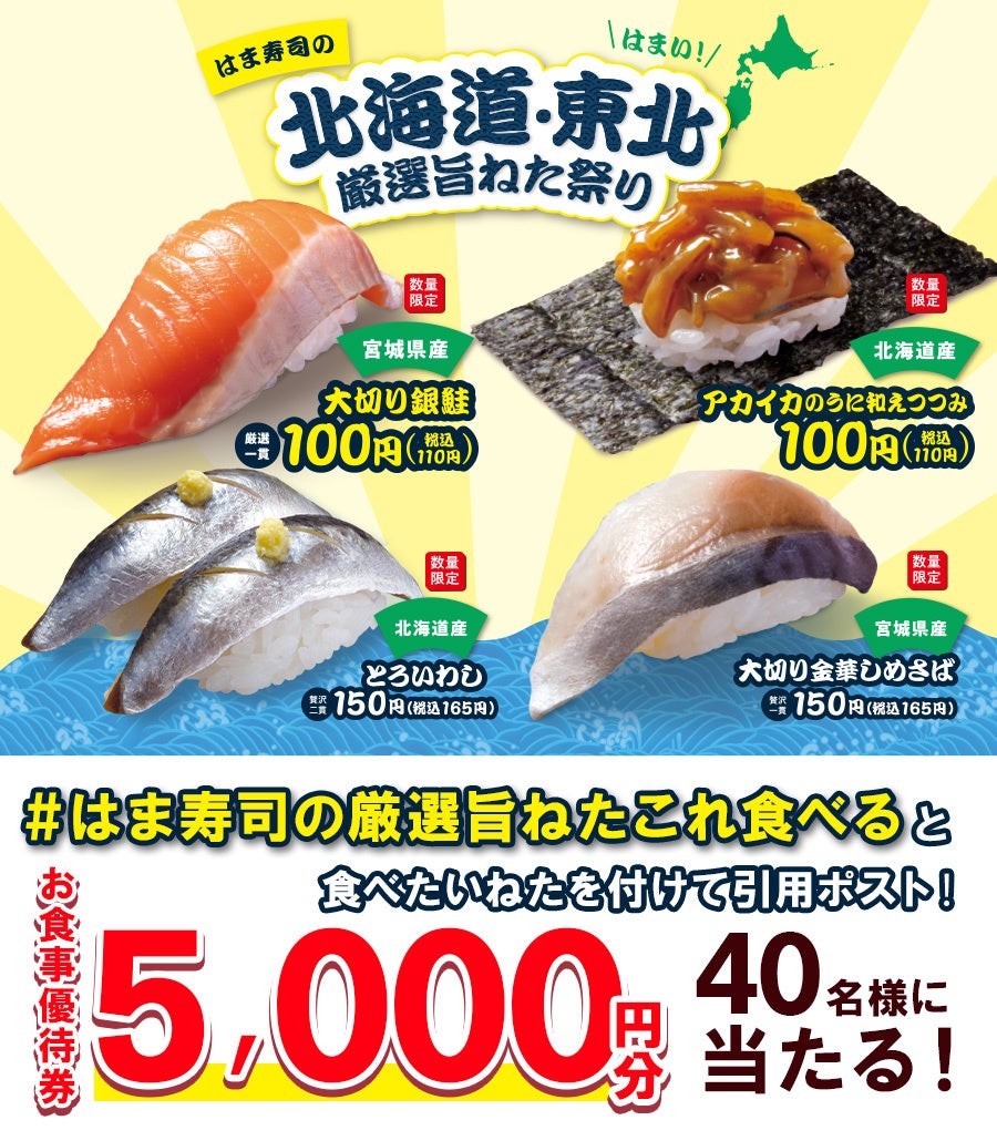 ぜひこの機会に、お近くのはま寿司で「はま寿司の北海道・東北厳選旨ねた祭り」をお楽しみください。