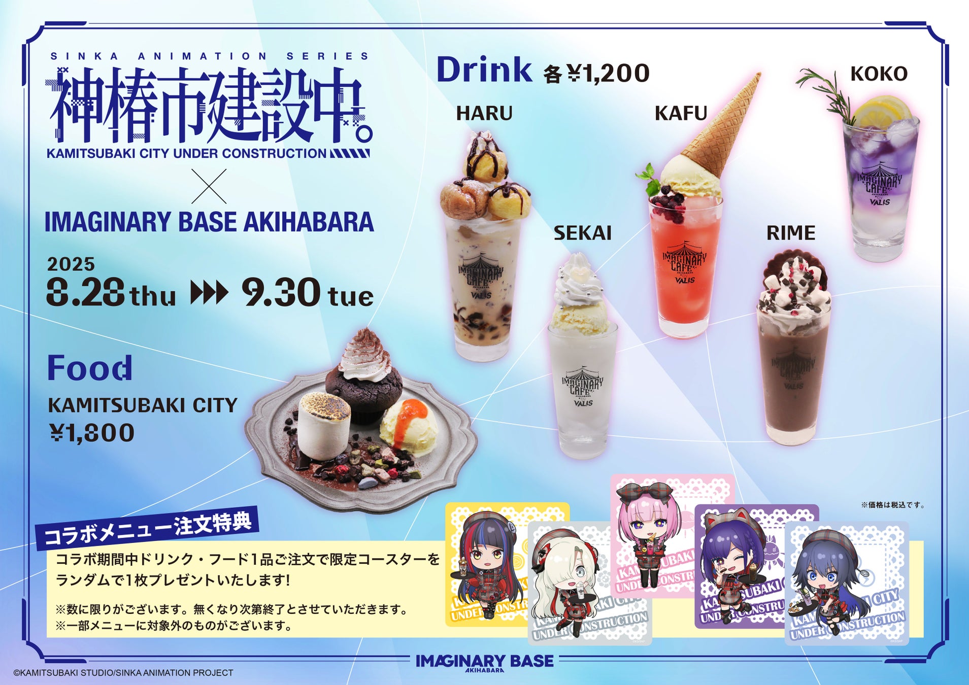 KAMITSUBAKI STUDIOが手がけるギャラリー併設型カフェ「IMAGINARY BASE AKIHABARA」にて、TVアニメ『神椿市建設中。』とのコラボを2025年8月28日(木)から9月30日(火)まで開催することが決定しました。