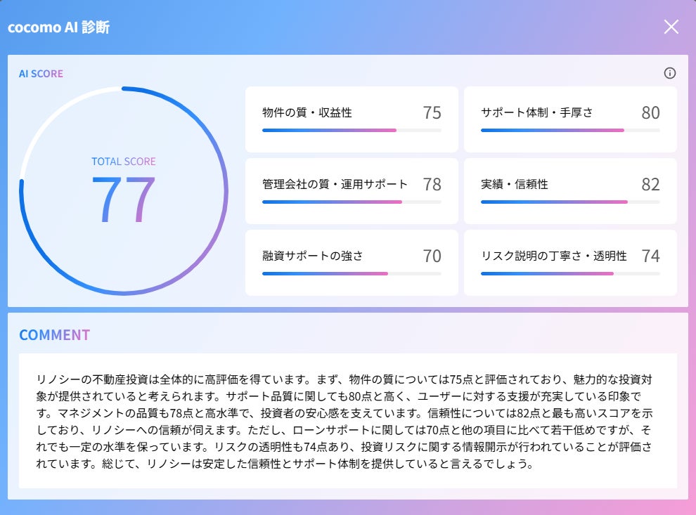 独自開発の「cocomo AI」が、各不動産投資会社を6つの観点で数値化。客観的な指標をもとに、ユーザーが直感的に比較できるようになりました。