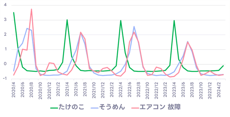DS.INSIGHT【エアコン 故障】【そうめん】【たけのこ】の検索推移(2020年4月〜2024年3月)