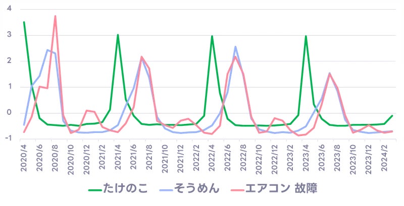「ヤフー・データソリューション」のデスクリサーチツール「DS.INSIGHT」で、【エアコン 故障】【そうめん】【たけのこ】の検索数を比較しました。その結果、【エアコン 故障】と【そうめん】はほぼ同じ時期にピークを迎えており、【たけのこ】の検索数は【エアコン 故障】の約3カ月前にピークとなっていることが分かりました。