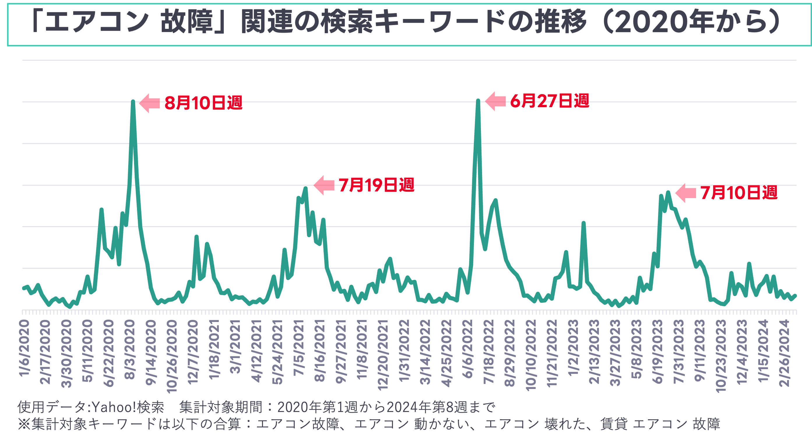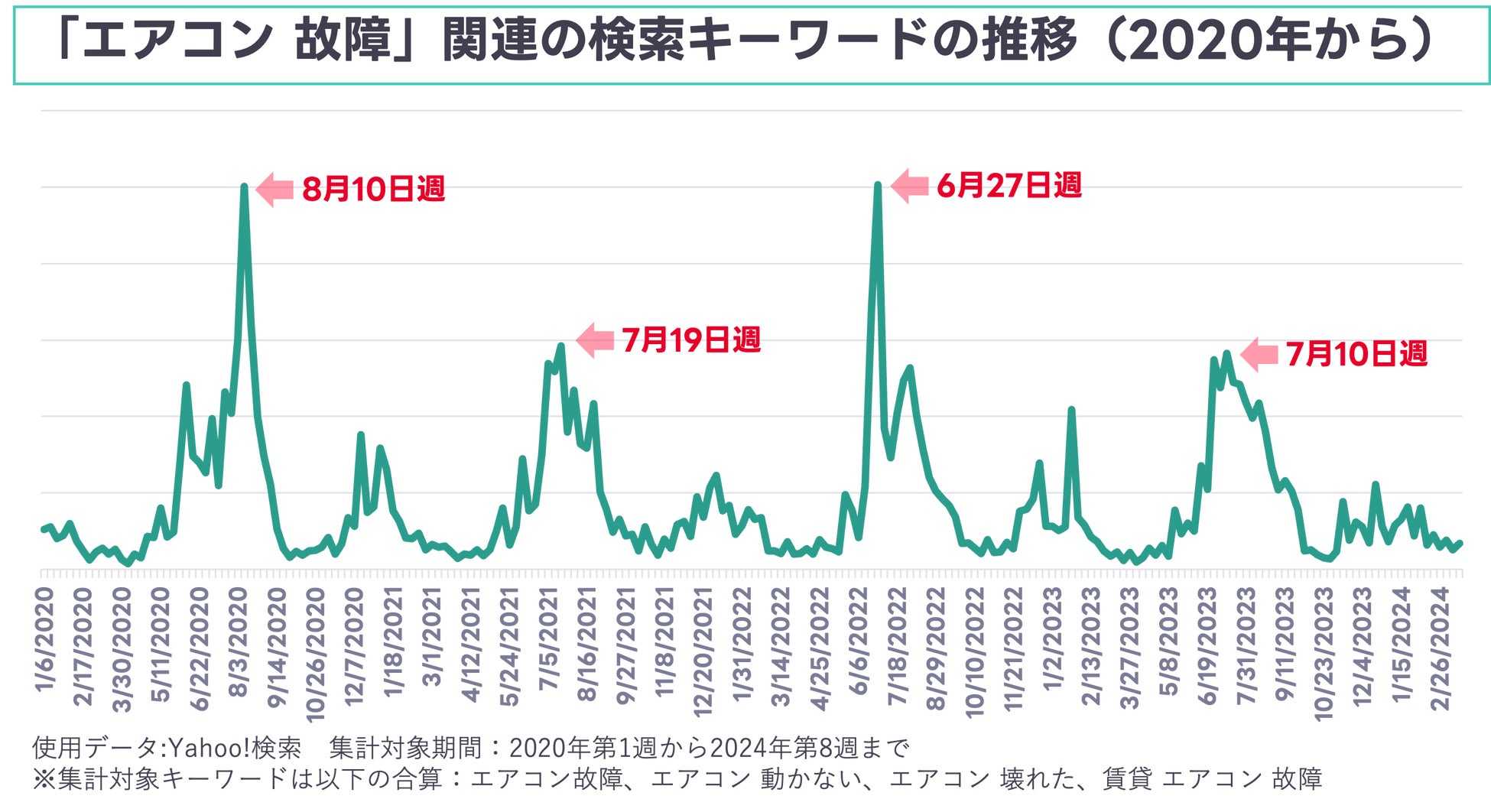 「ヤフー・データソリューション」でエアコンの故障に関する2020年以降の検索数推移を分析したところ、どの年もピークが7月頭~8月に位置しています。エアコンの故障に関する検索が増えるということは、修理や買い替えの需要も同じ時期に増えると推測できます。
