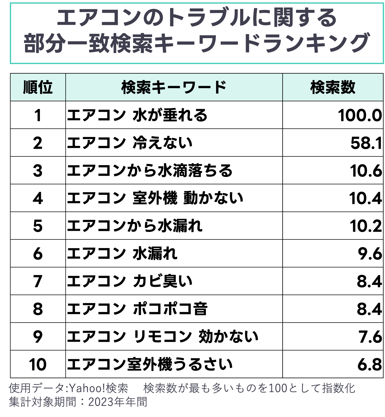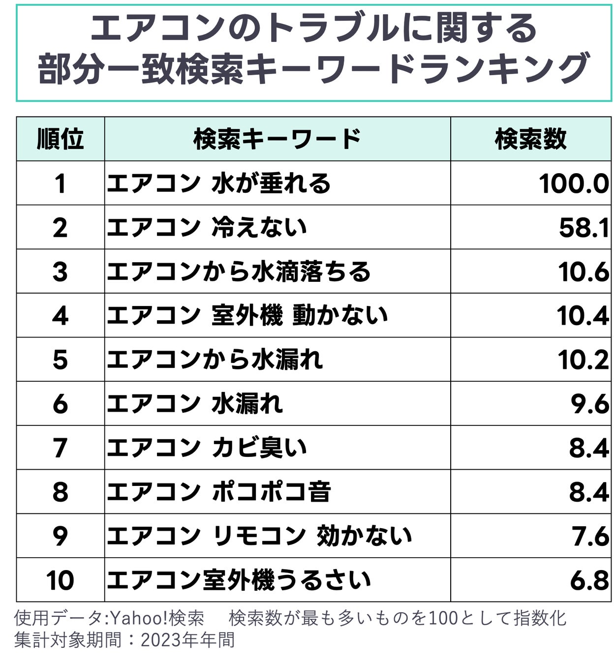 ■エアコンのトラブルに関する検索1位は「水が垂れる」、2位は「冷えない」
