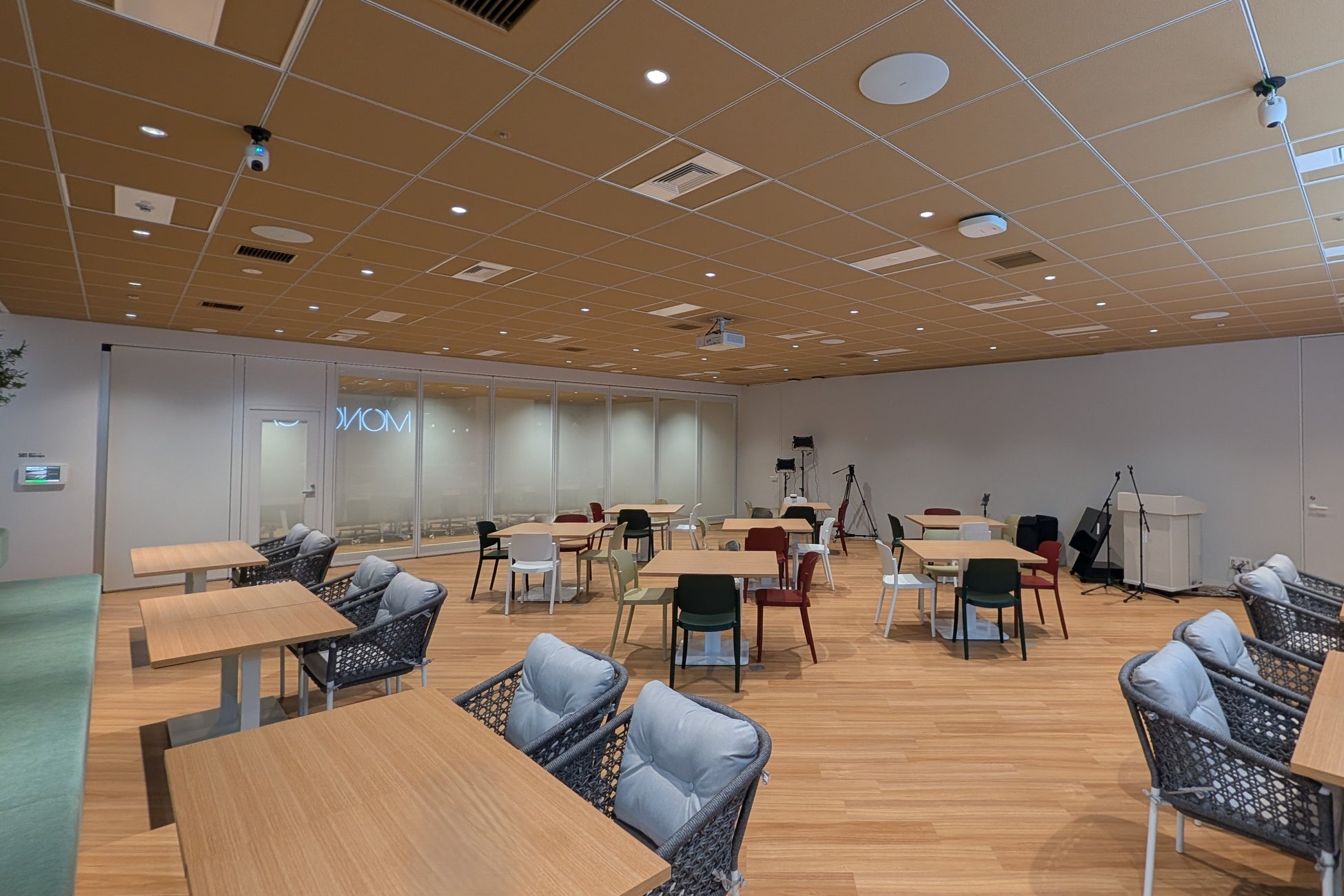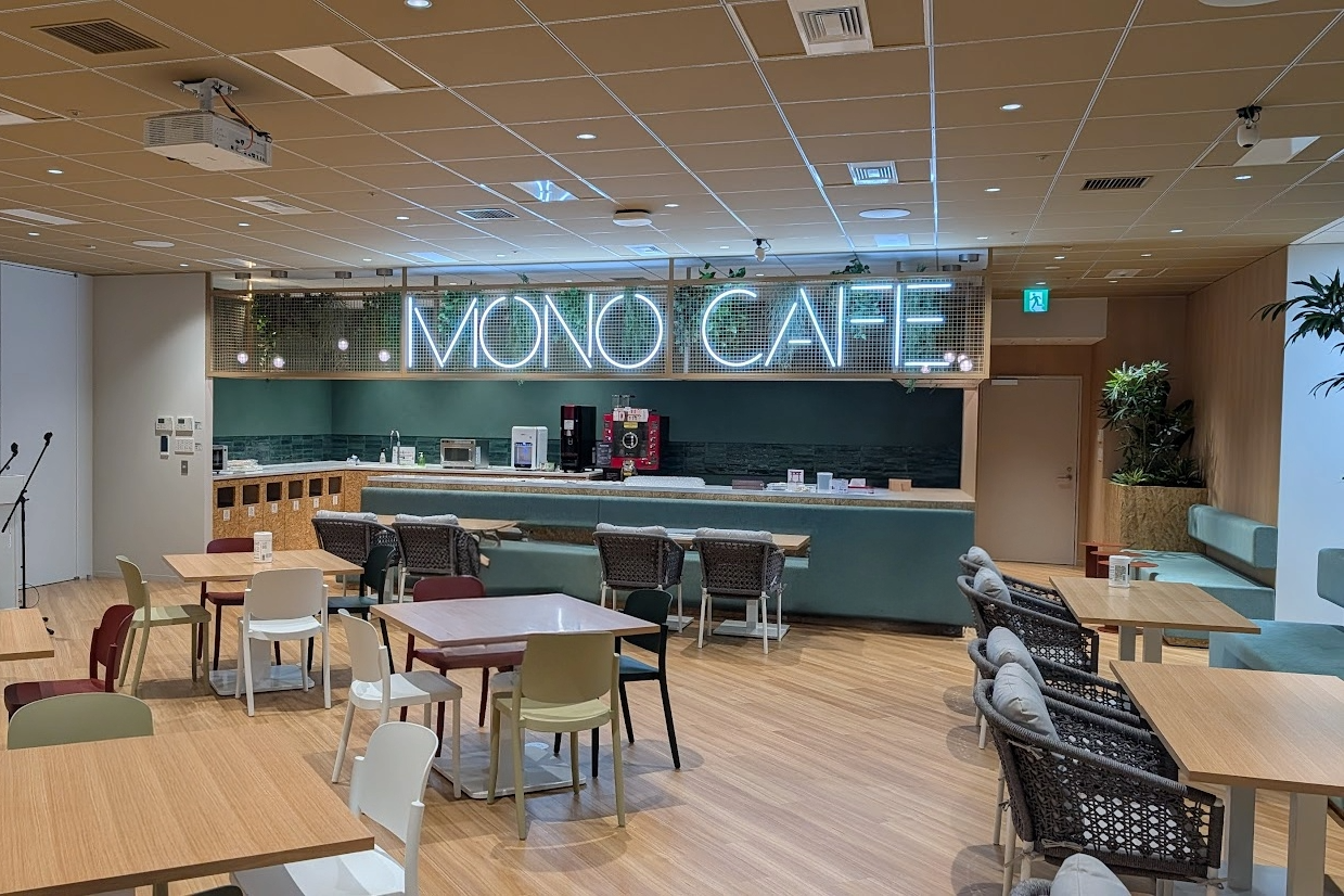 カフェ・イベントエリア:主に食事や休憩、部門を超えた交流の場として機能します。隣接する大会議室との間にあるスライディングウォールを開放することで、イベントなどにも活用可能な一体的空間となります。