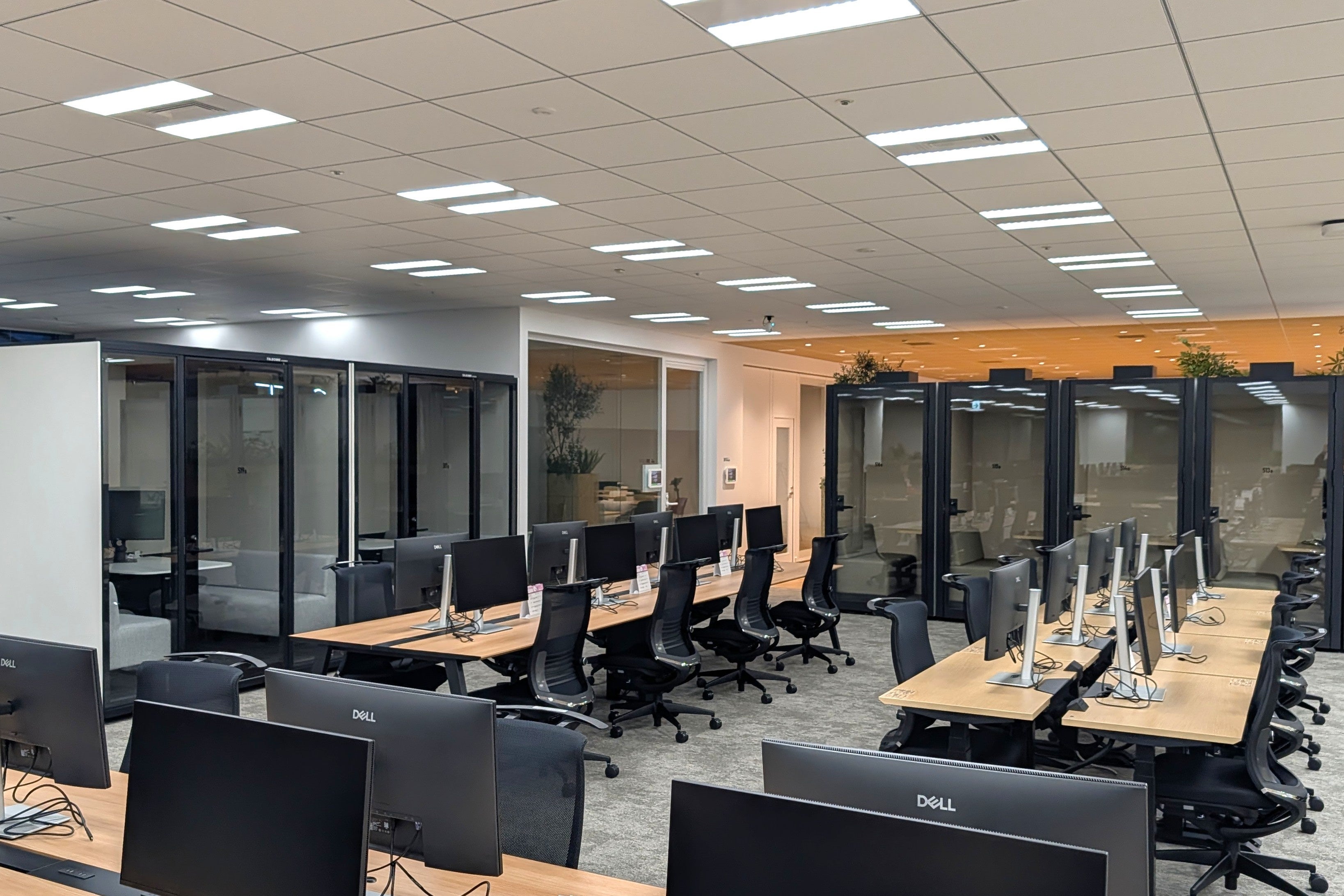 執務エリア: 「工場」としてアイデアを練り、成果を生み出す空間。フリーアドレス席を中心に、少人数用ブースや、窓際に配置されたオープンなミーティングスペースなど、集中とコラボレーションの双方を叶える多様なスペースを用意しています。