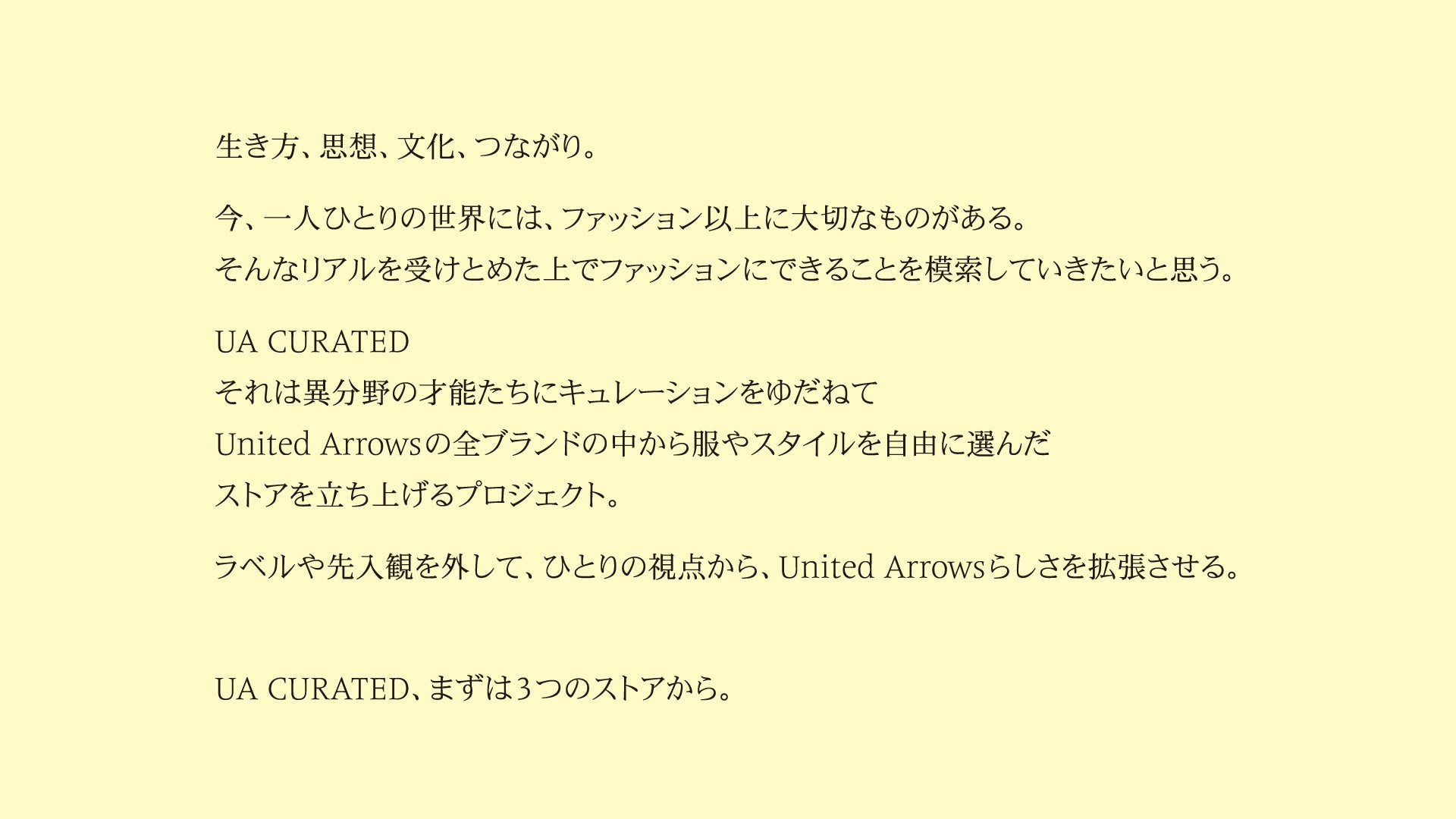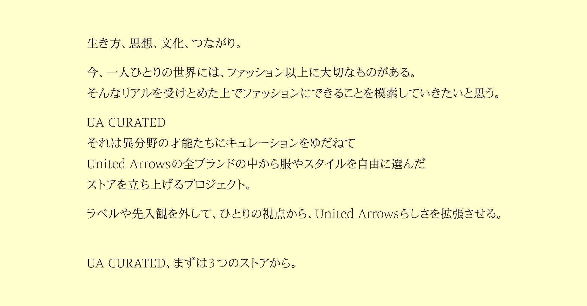 株式会社ユナイテッドアローズ(代表取締役 社長執行役員 CEO:松崎 善則、本社所在地:東京都渋谷区)は、ユナイテッドアローズの全ブランドのプロダクトから、時代に合った感性と視点でアイテムをセレクトし、新たな手法で提案するキュレーションストアプロジェクトである、「UA CURATED」を始動します。