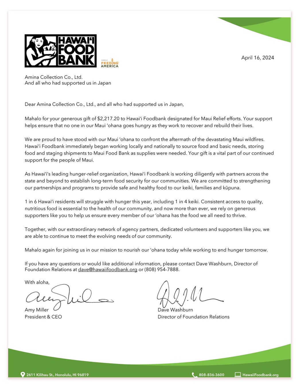 コロナ禍のハワイを救いたいと始まったこのプロジェクトは、ハワイの人々の飢餓を救うための食料支援プログラムです。2022年発生したマウイ島山火事災害後は、マウイに焦点を当て、対象商品の売上額の一部と店舗の募金箱に集まった寄付金を、ハワイフードバンクを通じてマウイの食料支援活動に役立てられています。