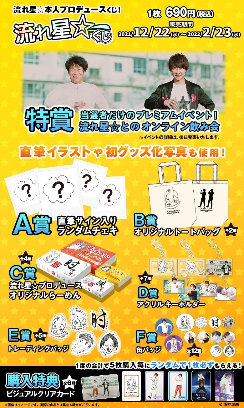 A賞は「流れ星☆」の直筆サイン入りの撮り下ろしチェキ、B賞はネタ中に登場する「肘神様」のイラストなどを使用したトートバッグ、C賞以下の賞品にも直筆イラストや初めてグッズ化される写真を使用し、豪華なラインナップとなっております。