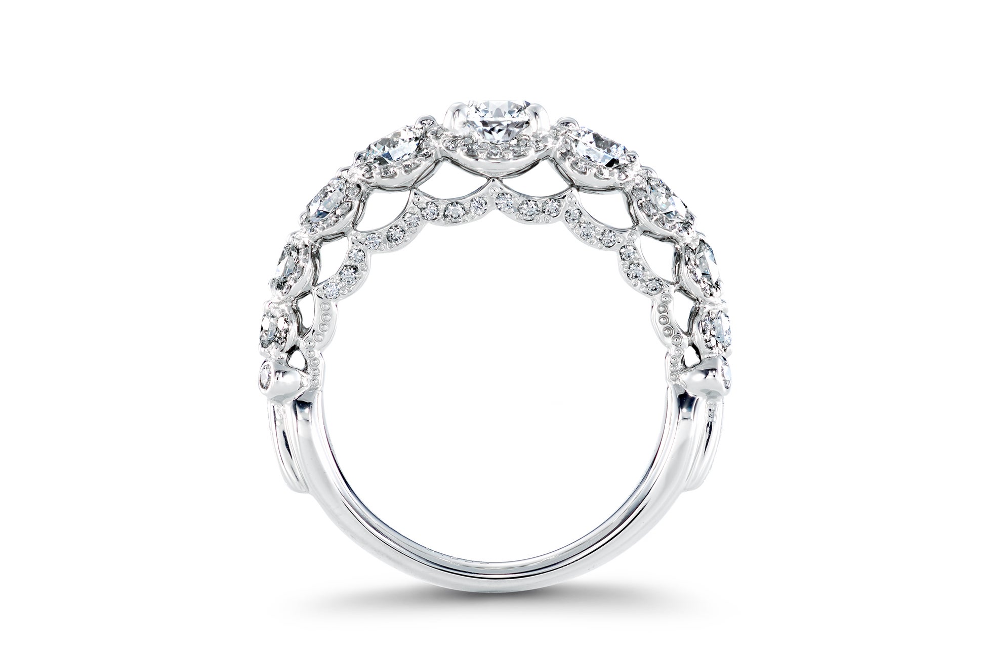 豪華に配された、9石全ての完璧な輝きのダイヤモンドを余すことなく堪能できるデザイン。指のラインに合うよう丸みを帯びた形状です。空間も美しくデザインしているサイドビュー。輝きだけで連なるようなラインはヨーロッパの美しいベールの装飾をイメージしています。