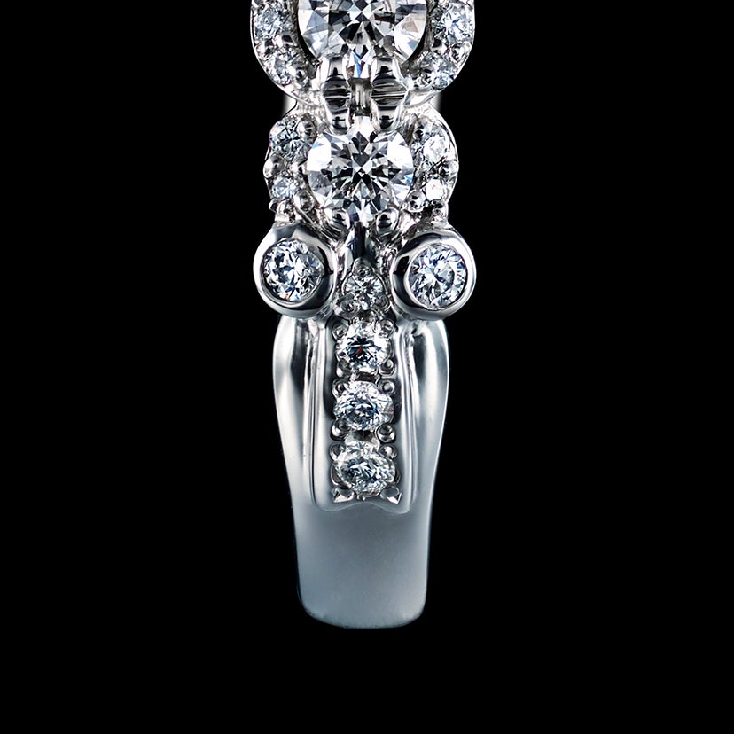 サイドのダイヤモンドの石座位置がセンターダイヤに近づくにつれて少しずつ高くなるため、より立体感を感じられ、美しく輝きます。