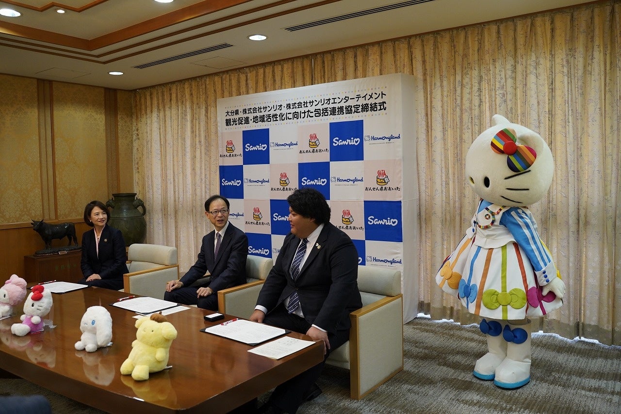 大分県庁舎本館4階貴賓室で行われた締結式では、大分県知事の佐藤樹一郎氏、株式会社サンリオ代表取締役社長の辻󠄀朋邦、株式会社サンリオエンターテイメント代表取締役社長の小巻亜矢が出席し、協定書に署名しました。また、ハローキティも特別ゲストとして参加し、出席者との記念撮影が行われました。