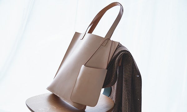 外観はレザーとステッチのみのシンプルな素材使いながら直線と曲線を上手く織り交ぜたデザインで存在感のあるトートバッグです。横幅が約27cmとコンパクトなため、すっきりとしたサイズ感で男女ともに使い勝手の良い設計です。また、オフシーンのみではなく、ジャケパンなどのオンシーンのスタイリングにもサッと馴染んでくれて様々なシチュエーションで使い勝手の良いバッグです。