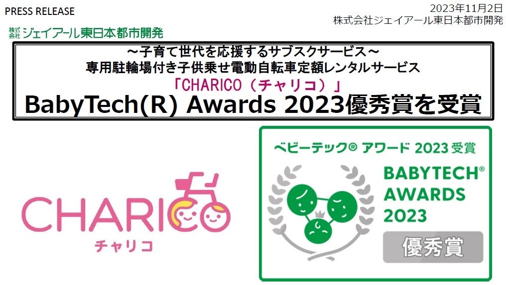専用駐輪場付き子供乗せ電動自転車定額レンタルサービス「CHARICO(チャリコ)」が2023年10月31日にBabyTech(R)Awards 2023 実行委員会が主催する「BabyTech(R) Awards 2023withアカチャンホンポ」にて「保護者支援一般部門 優秀賞」を受賞しました。