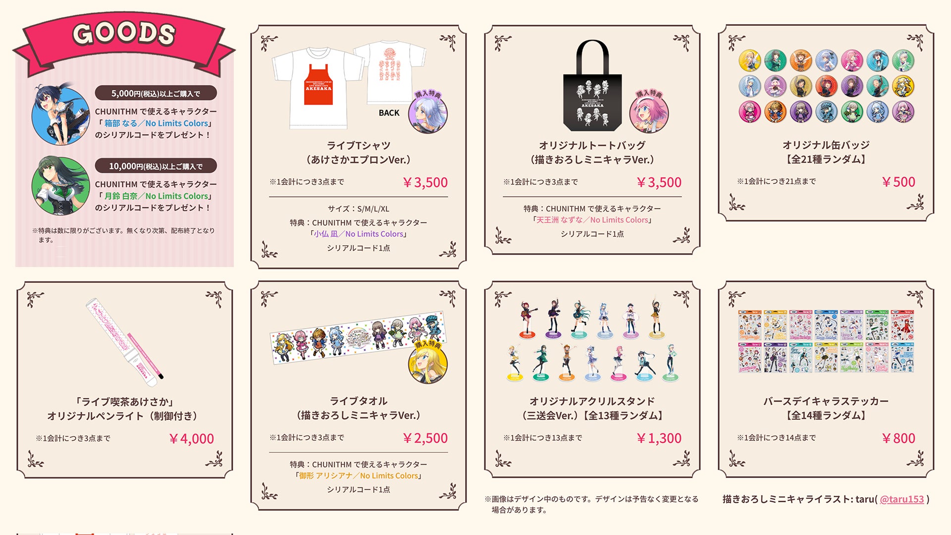 開催に先駆けて、当日会場にて販売するライブグッズの詳細を公開いたしました。「ライブ喫茶あけさか」のエプロンに身を包んだ描き下ろしSDイラストを使用したグッズなど、このライブのために製作したオリジナルグッズを販売いたします。