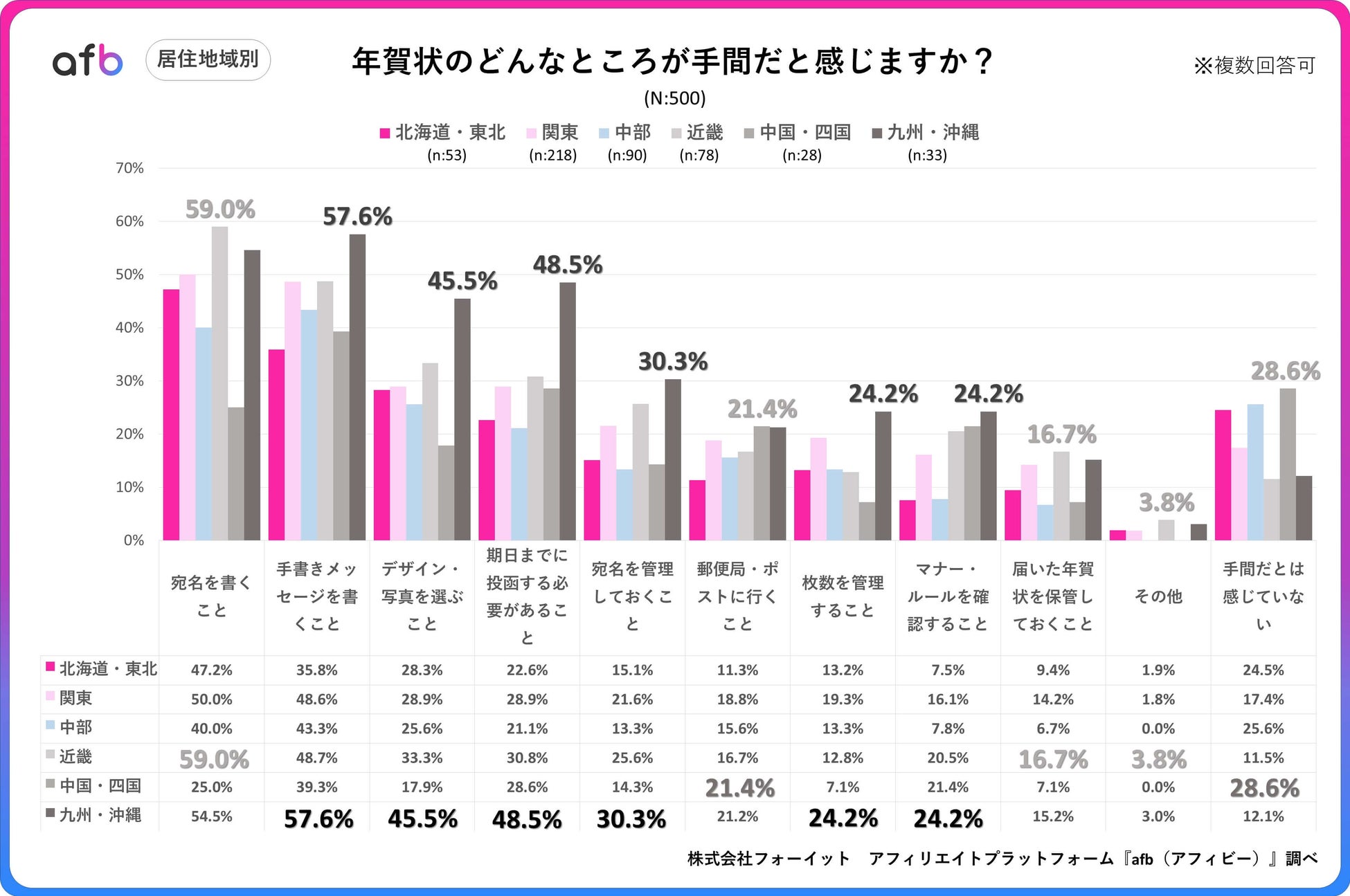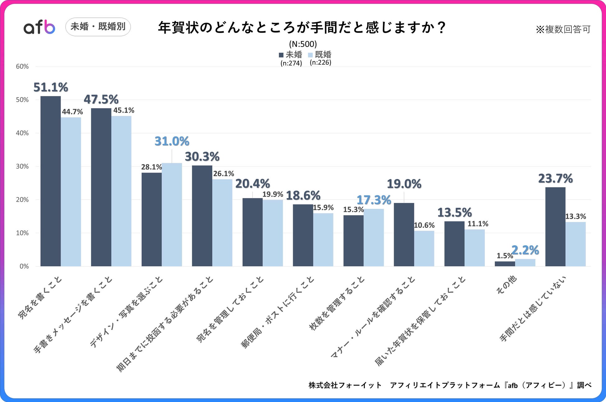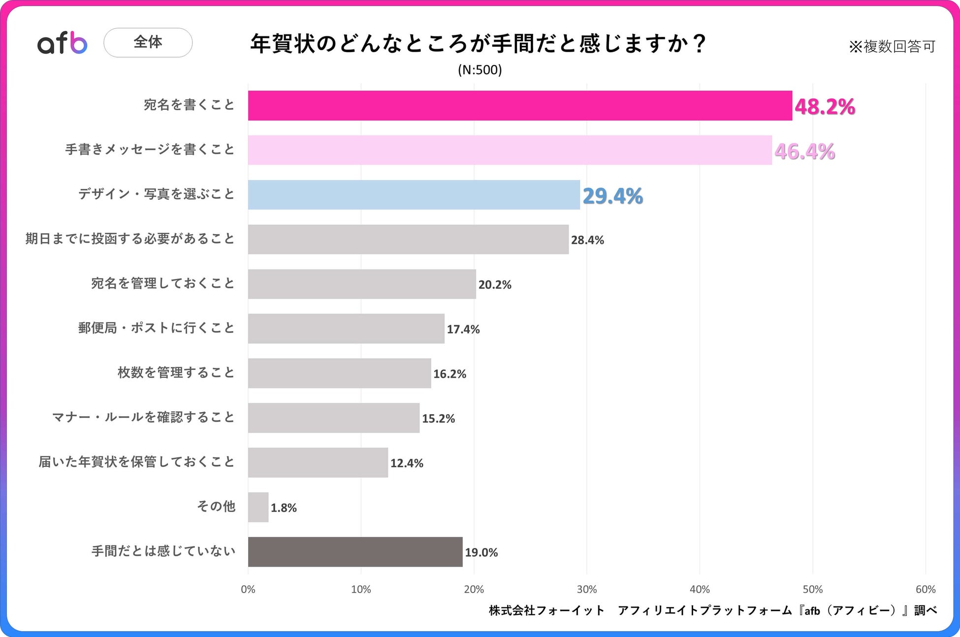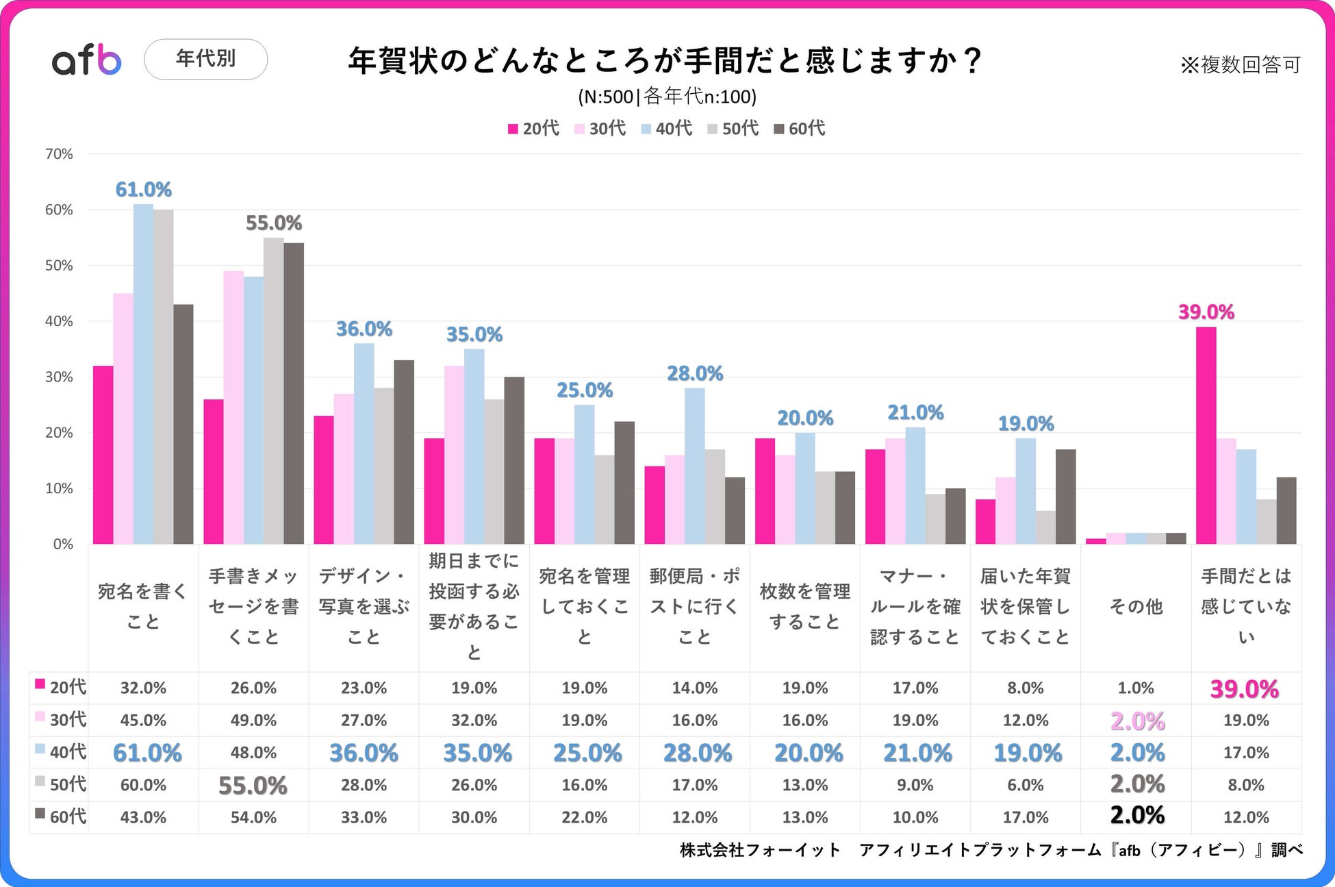 アフィリエイトプラットフォーム「afb(アフィビー)」< https://www.afi-b.com/ >の開発運用をおこなう株式会社フォーイットは、全国の20代~60代までの男女500人を対象に年賀状に関するアンケートを実施し、年代別等の特徴についてまとめました。