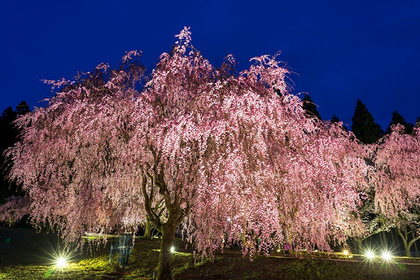 静かな山里の竹田地区はしだれ桜の里として知られ、福井県内でも人気のお花見スポット。なかでも清流そばの「たけくらべ広場」には約100本のしだれ桜が植えられ、濃いピンクの花びらが満開になる様子は圧巻です。