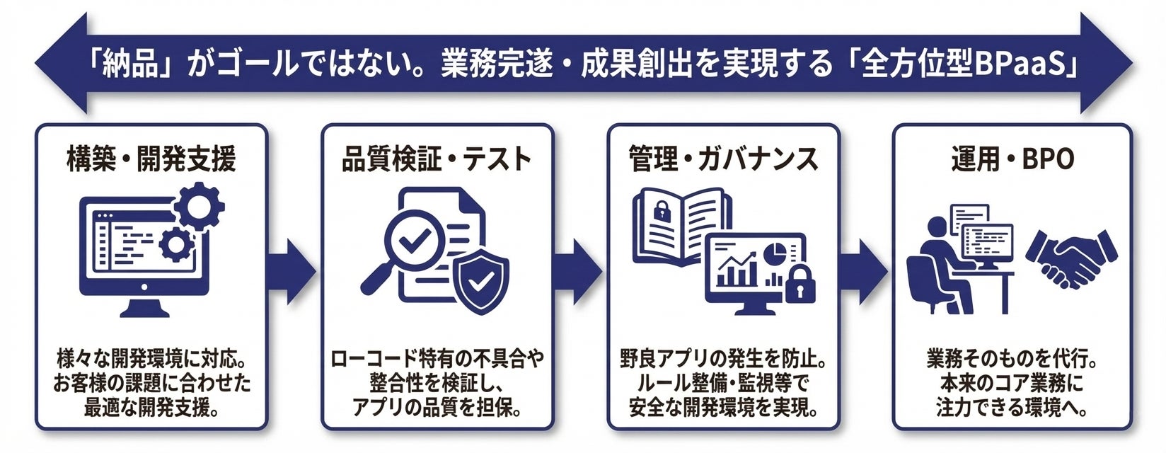 本サービスは、開発したシステムの「納品」をゴールとしていた従来のモデルとは異なり、「業務プロセスの完遂」まで責任を持つトータルソリューションです。長年培ってきたテスト・検証のノウハウを活かし、高品質なローコード開発環境の構築からその後の運用・業務代行までを包括的にサポートします。